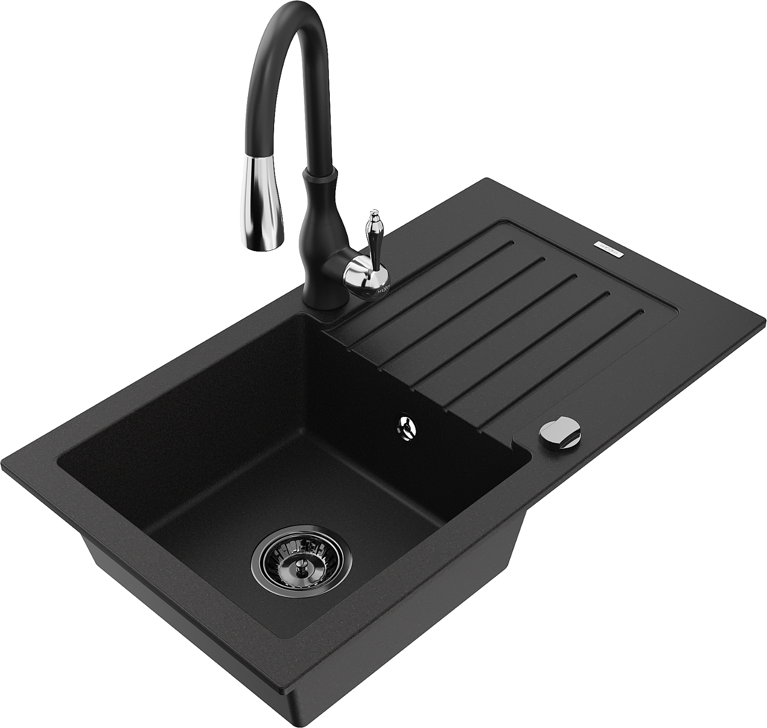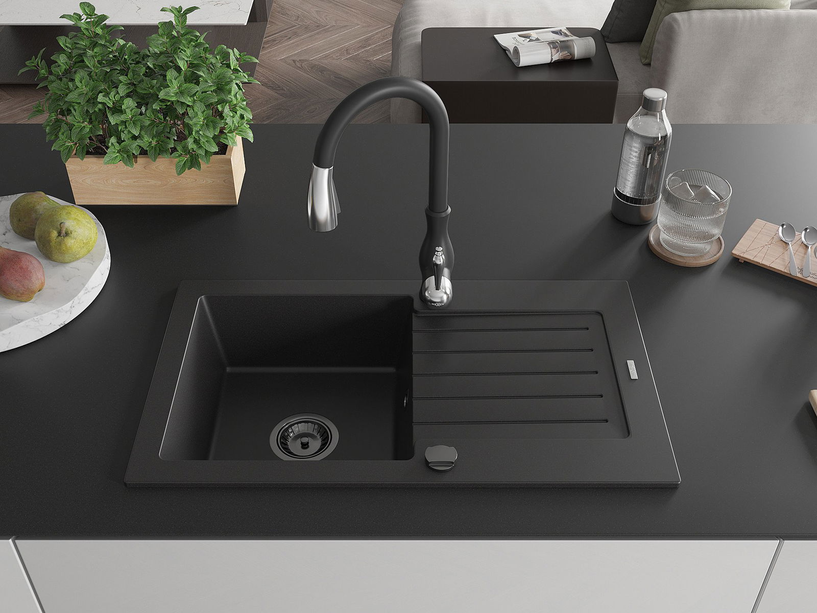 Mexen Pablo Granitspüle 1-Becken mit Abtropffläche und Küchenarmatur Savita, schwarz - 6510-77-672601-70-B