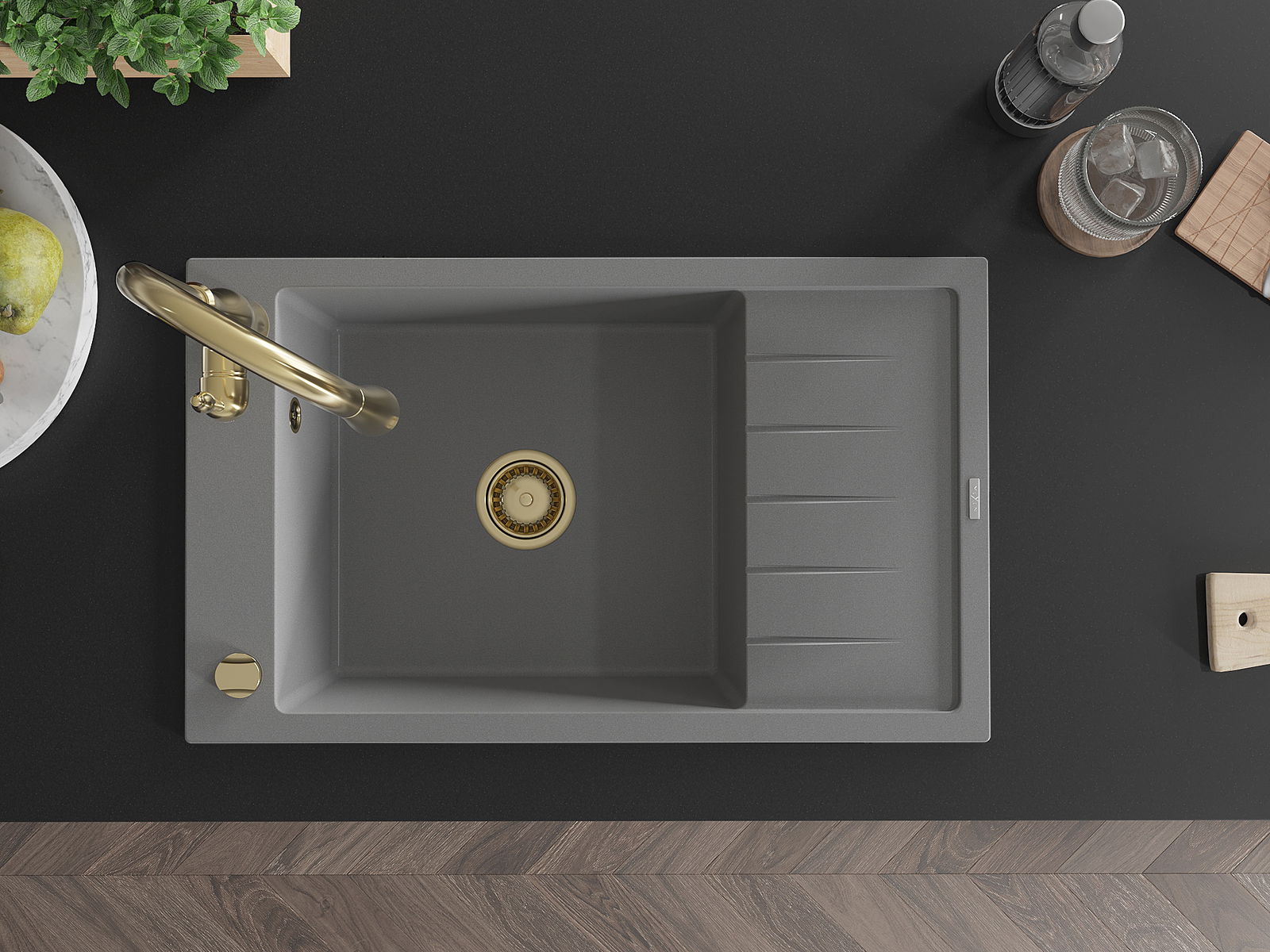 Die Spüle besteht aus hochwertigem Granit. Es ist eine elegante und vor allem praktische Ergänzung zu jeder Küche, unabhängig von ihrem Stil. Hohe Qualität und Granitdauer sorgen für eine langjährige Nutzung.
