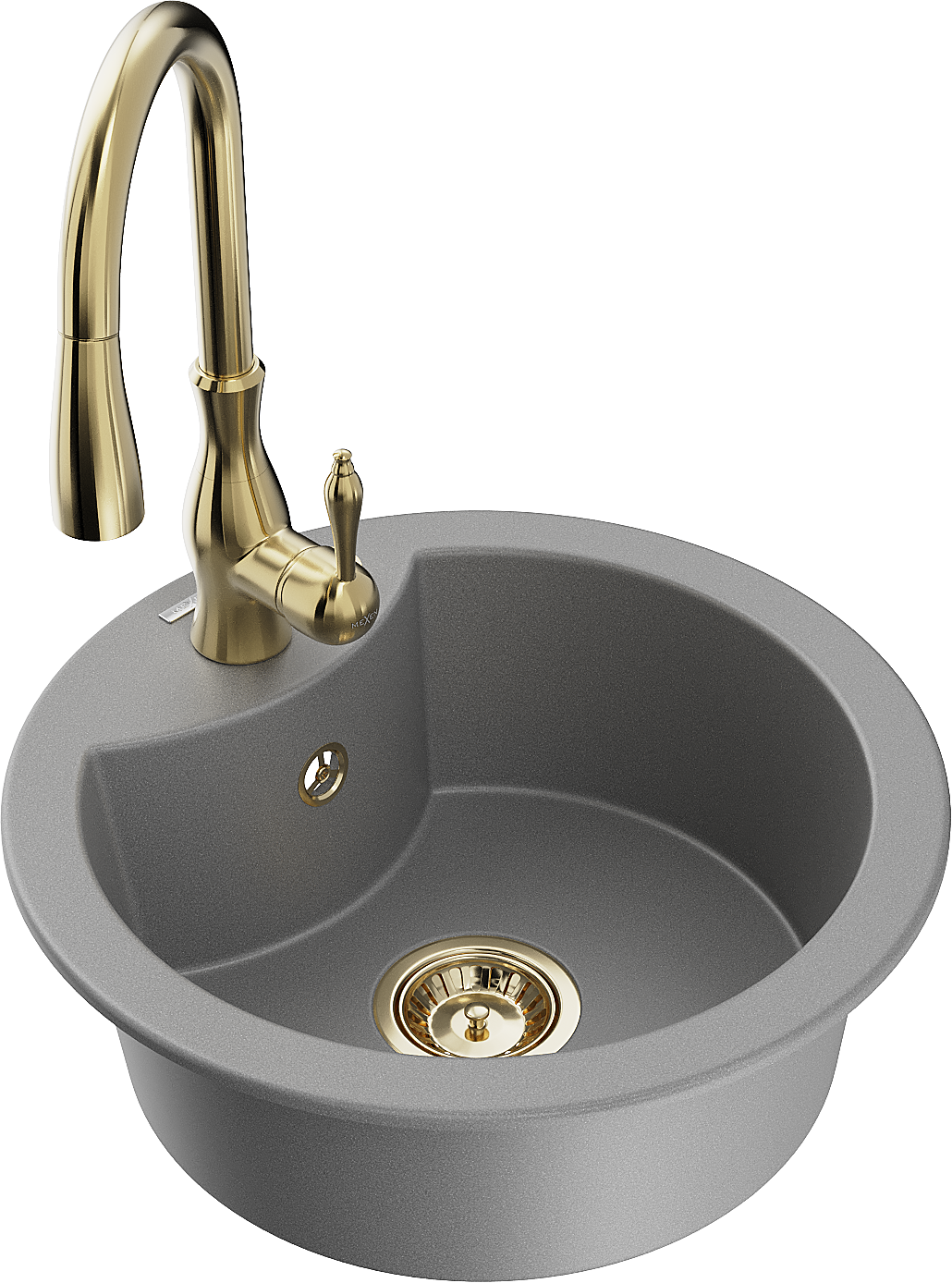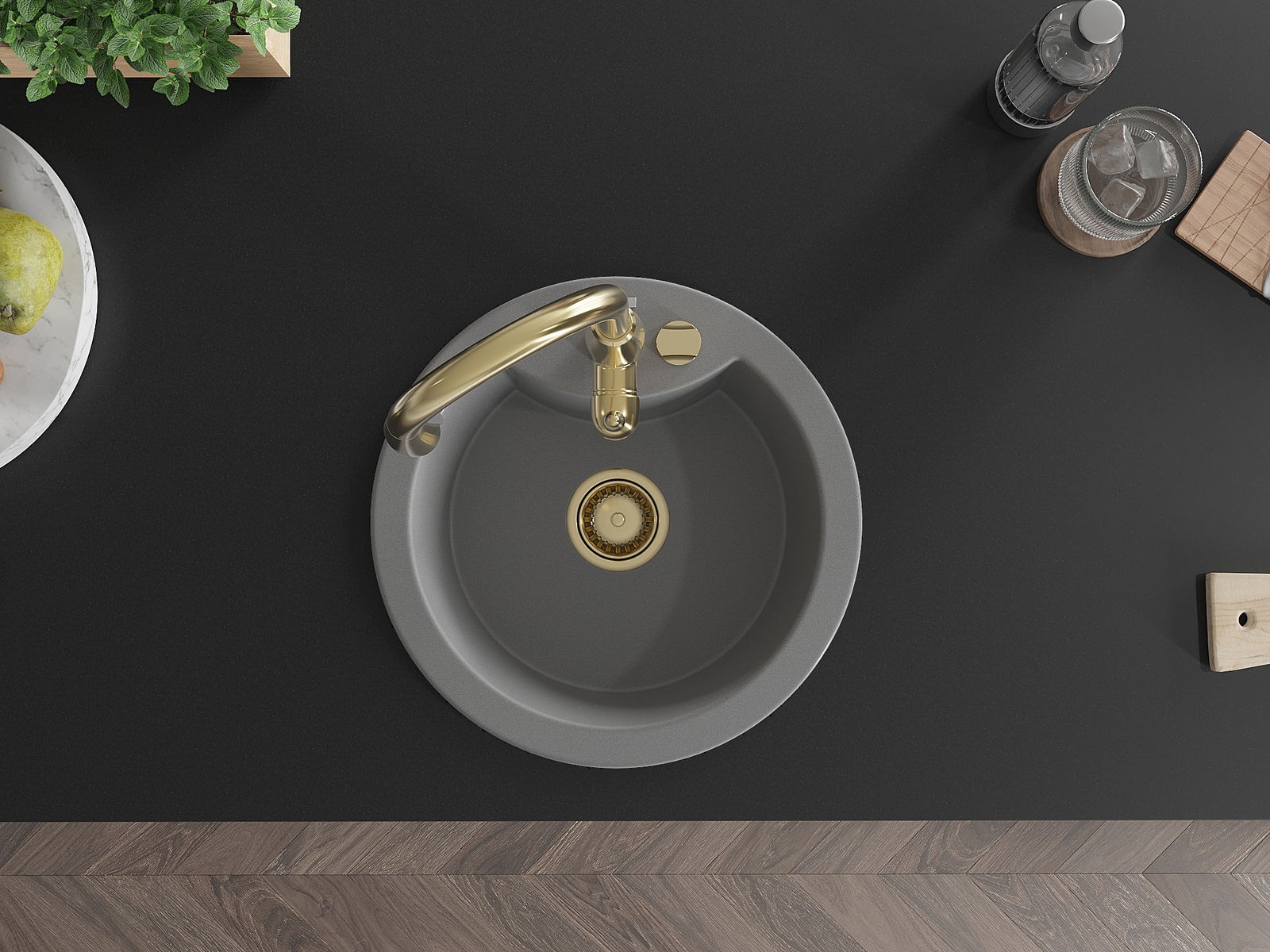 Die Spüle besteht aus hochwertigem Granit. Es ist eine elegante und vor allem praktische Ergänzung zu jeder Küche, unabhängig von ihrem Stil. Hohe Qualität und Granitdauer sorgen für eine langjährige Nutzung.