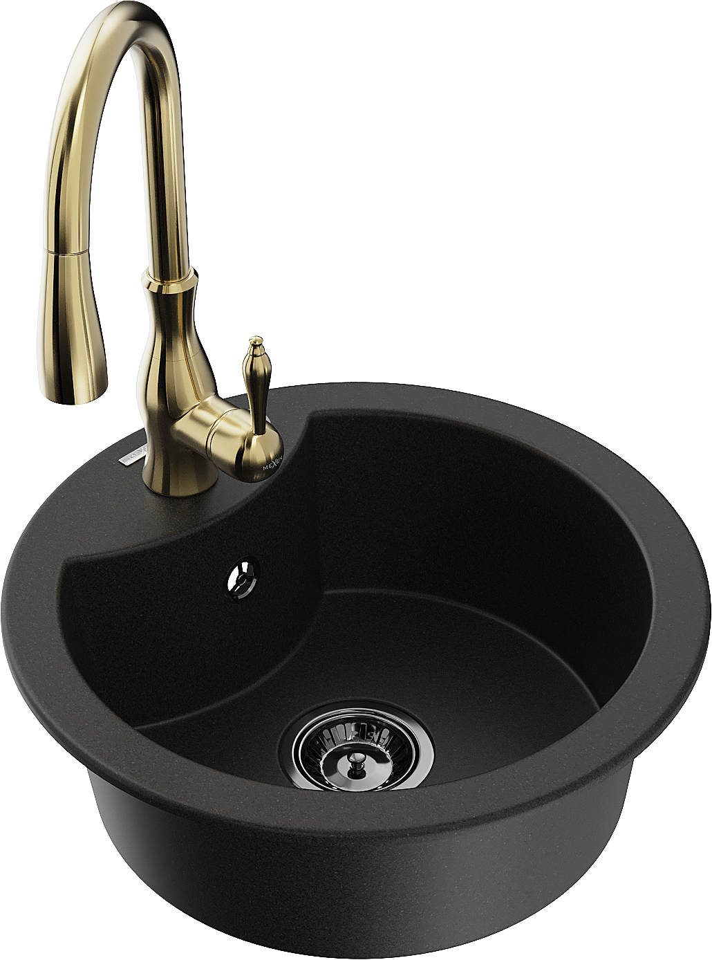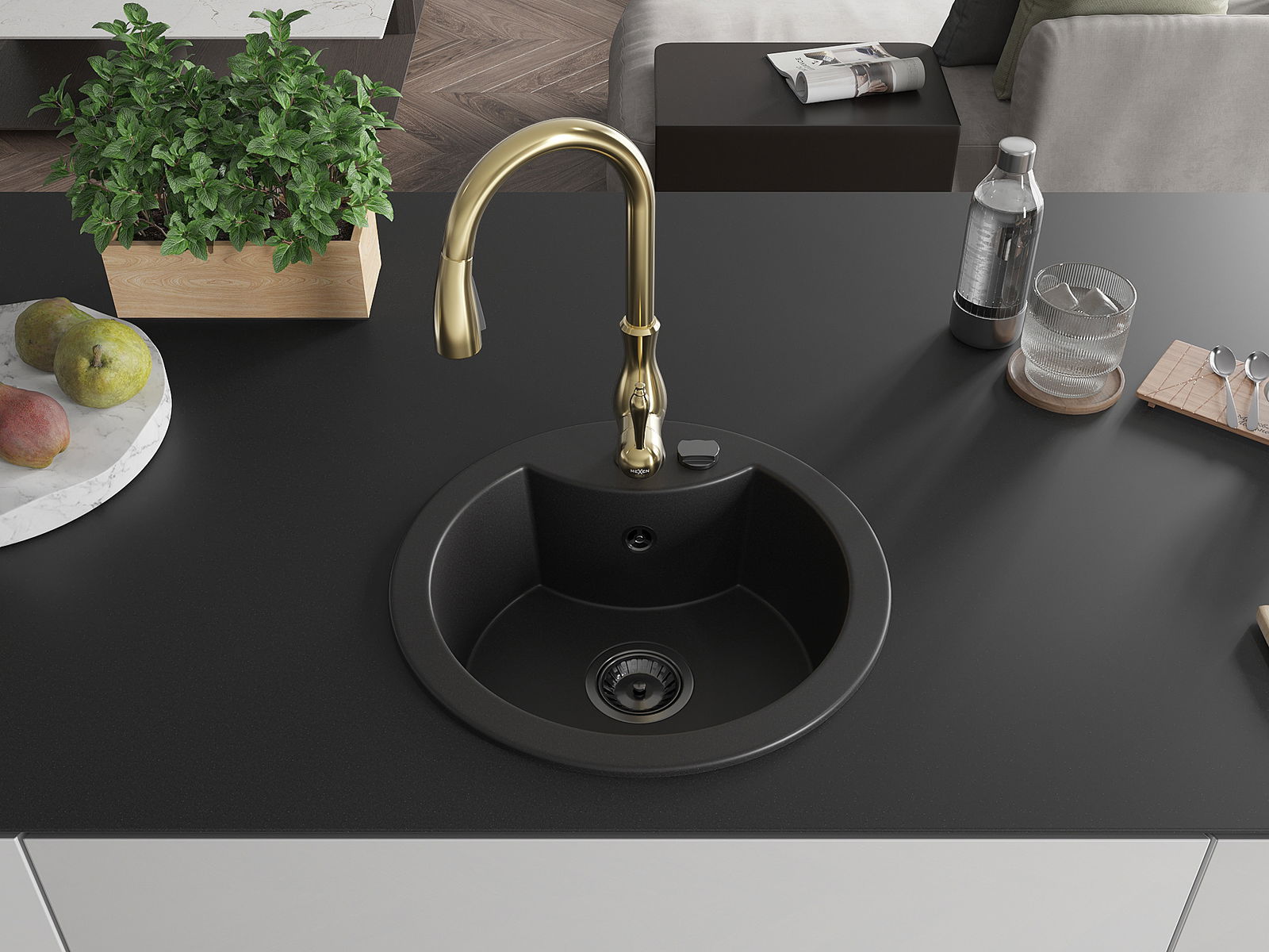 Die Spüle besteht aus hochwertigem Granit. Es ist eine elegante und vor allem praktische Ergänzung zu jeder Küche, unabhängig von ihrem Stil. Hohe Qualität und Granitdauer sorgen für eine langjährige Nutzung.