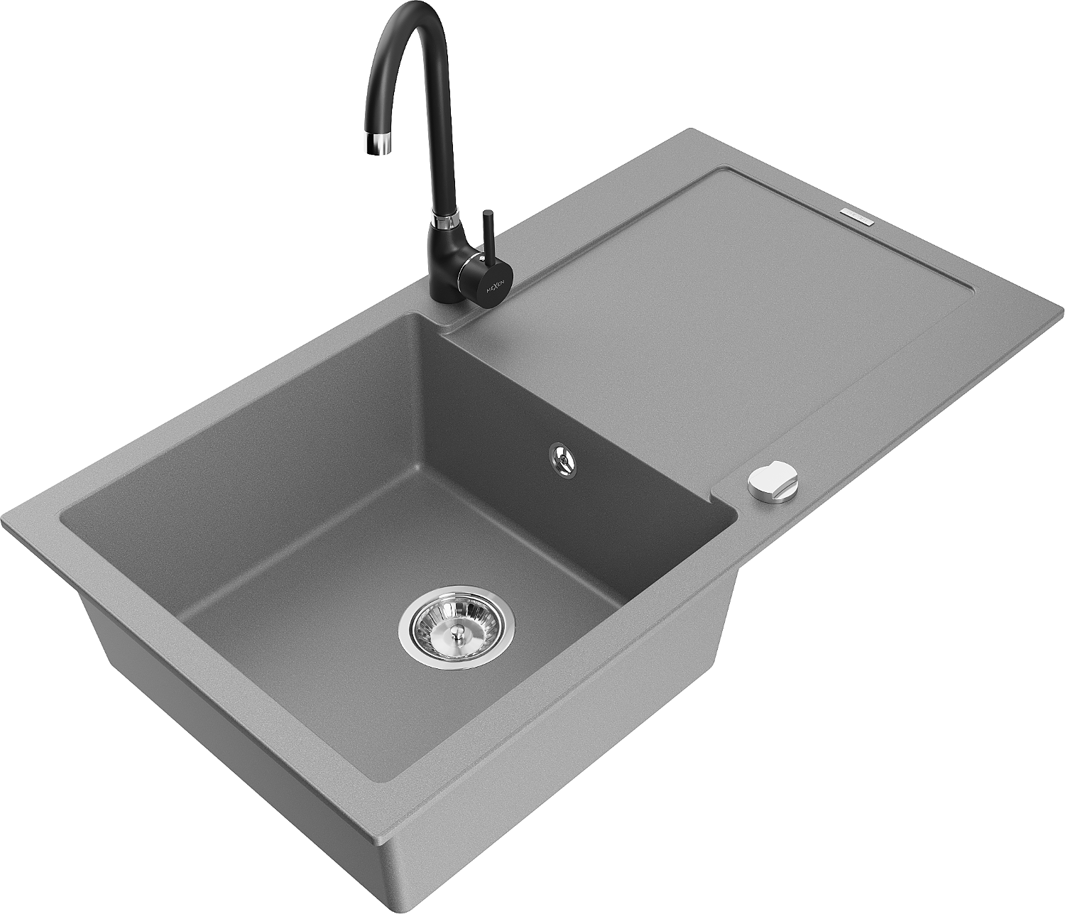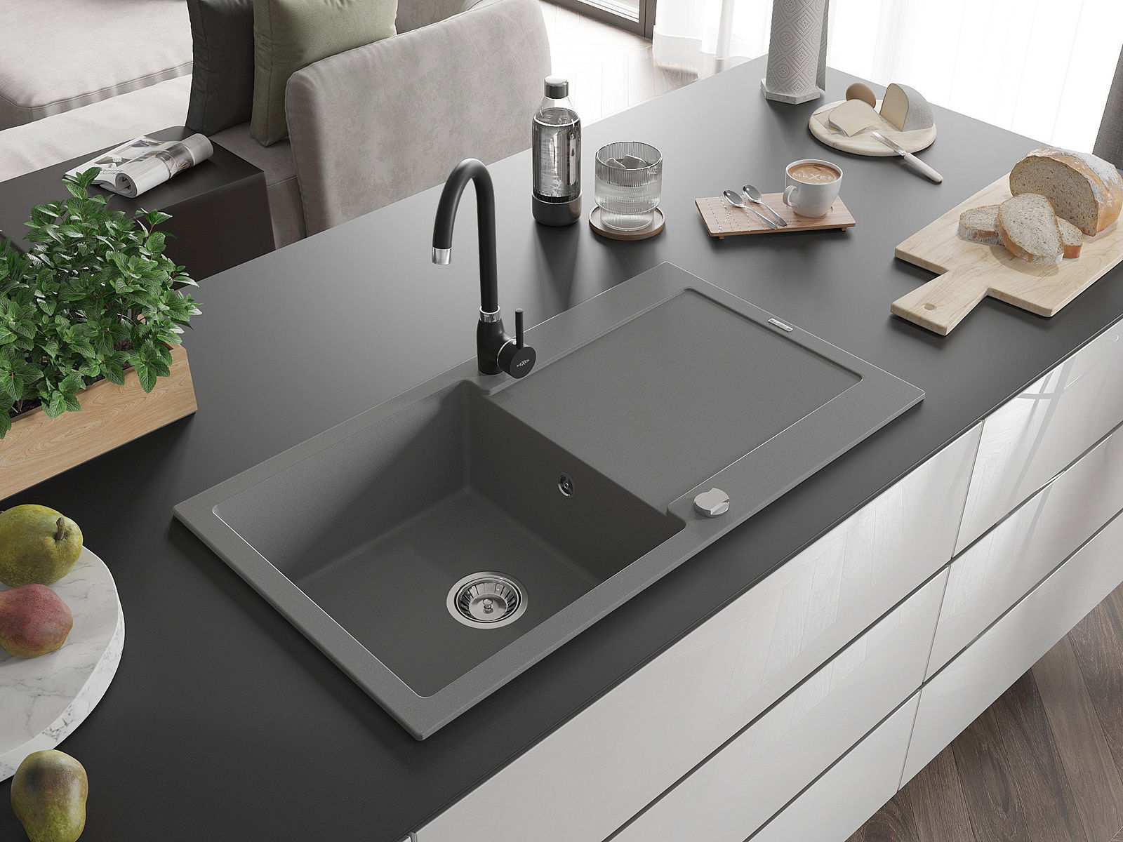 Mexen Leo Granitspüle 1-beckig mit Abtropffläche und Küchenarmatur Telma, grau - 6501-71-670200-70