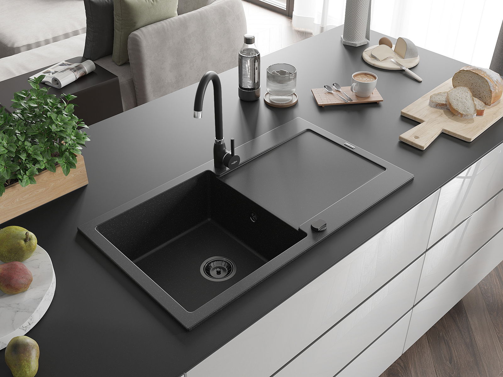Die Spüle besteht aus hochwertigem Granit. Es ist eine elegante und vor allem praktische Ergänzung zu jeder Küche, unabhängig von ihrem Stil. Hohe Qualität und Granitdauer sorgen für eine langjährige Nutzung.