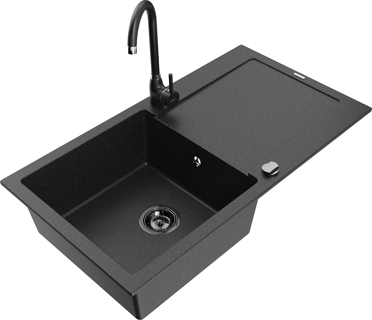 Mexen Leo Granitspüle 1-Kammer mit Abtropffläche und Küchenarmatur Telma, schwarz/silber metallic - 6501-73-670200-70-B