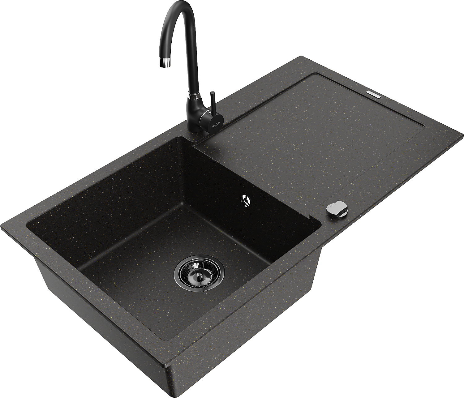 Mexen Leo Granitspüle 1-Becken mit Abtropffläche und Küchenarmatur Telma, schwarz/goldener Metallic - 6501-75-670200-70-B