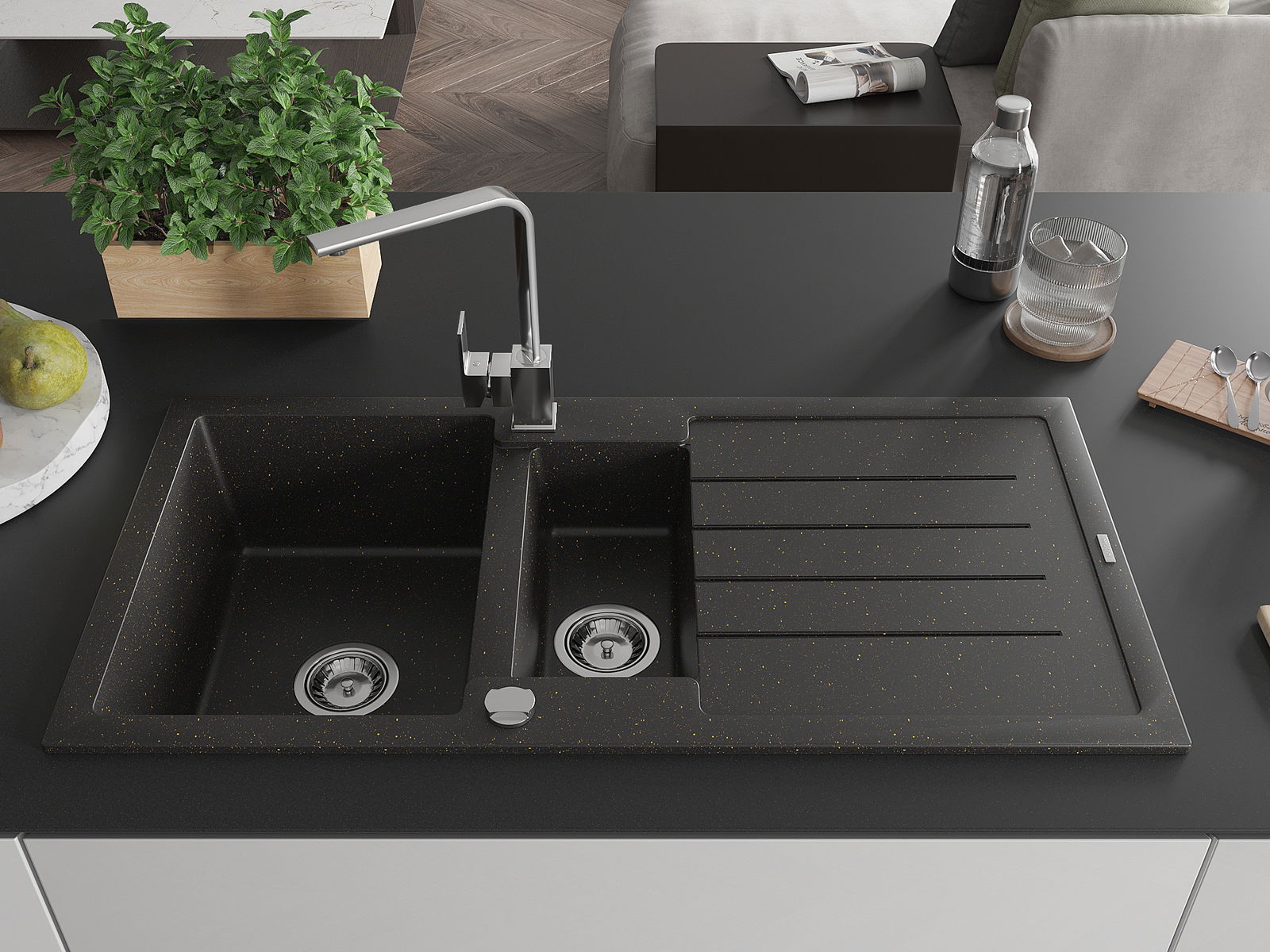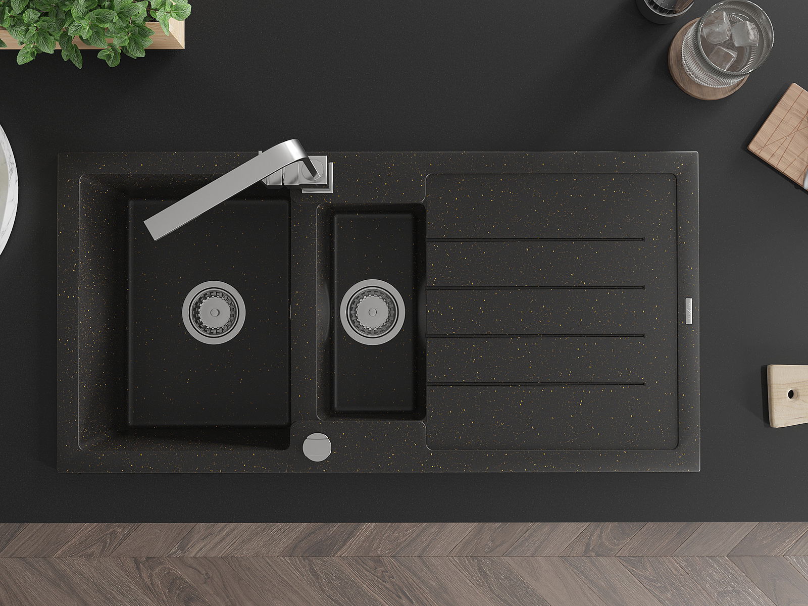 Mexen Andres Granitspüle 1,5-Becken mit Abtropffläche und Küchenarmatur Rita, schwarz/gold metallic- 6515-75-670300-00