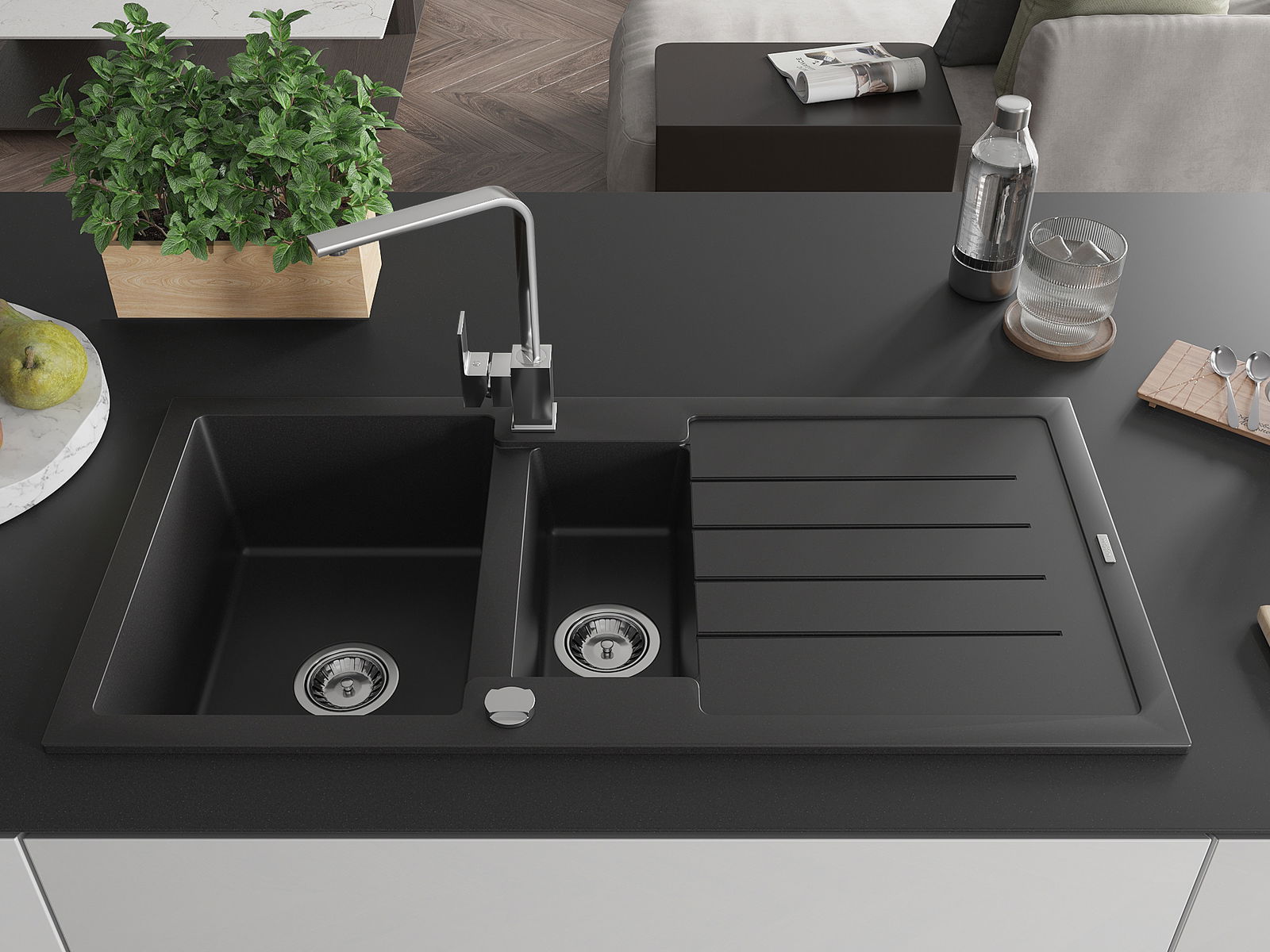 Die Spüle besteht aus hochwertigem Granit. Es ist eine elegante und vor allem praktische Ergänzung zu jeder Küche, unabhängig von ihrem Stil. Hohe Qualität und Granitdauer sorgen für eine langjährige Nutzung.