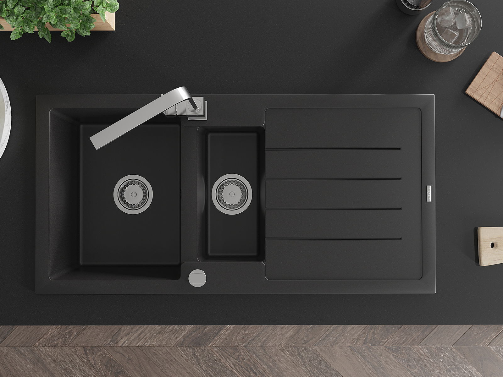 Dank des universellen Montagesystems ist die Spüle reversibel und der Abfluss kann links oder rechts auf der Theke montiert werden. Auf diese Weise können Sie die Seite einfach an Ihre Bedürfnisse und Bedingungen einstellen.