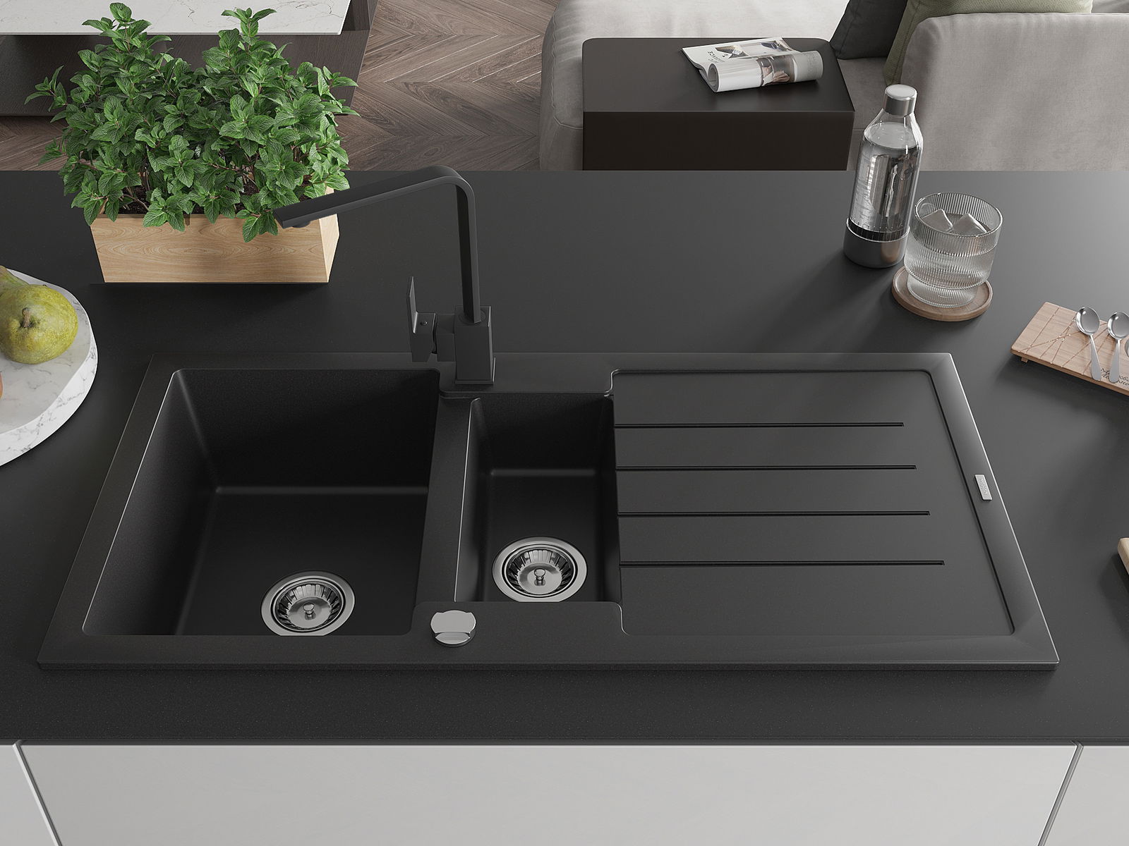 Die Spüle besteht aus hochwertigem Granit. Es ist eine elegante und vor allem praktische Ergänzung zu jeder Küche, unabhängig von ihrem Stil. Hohe Qualität und Granitdauer sorgen für eine langjährige Nutzung.