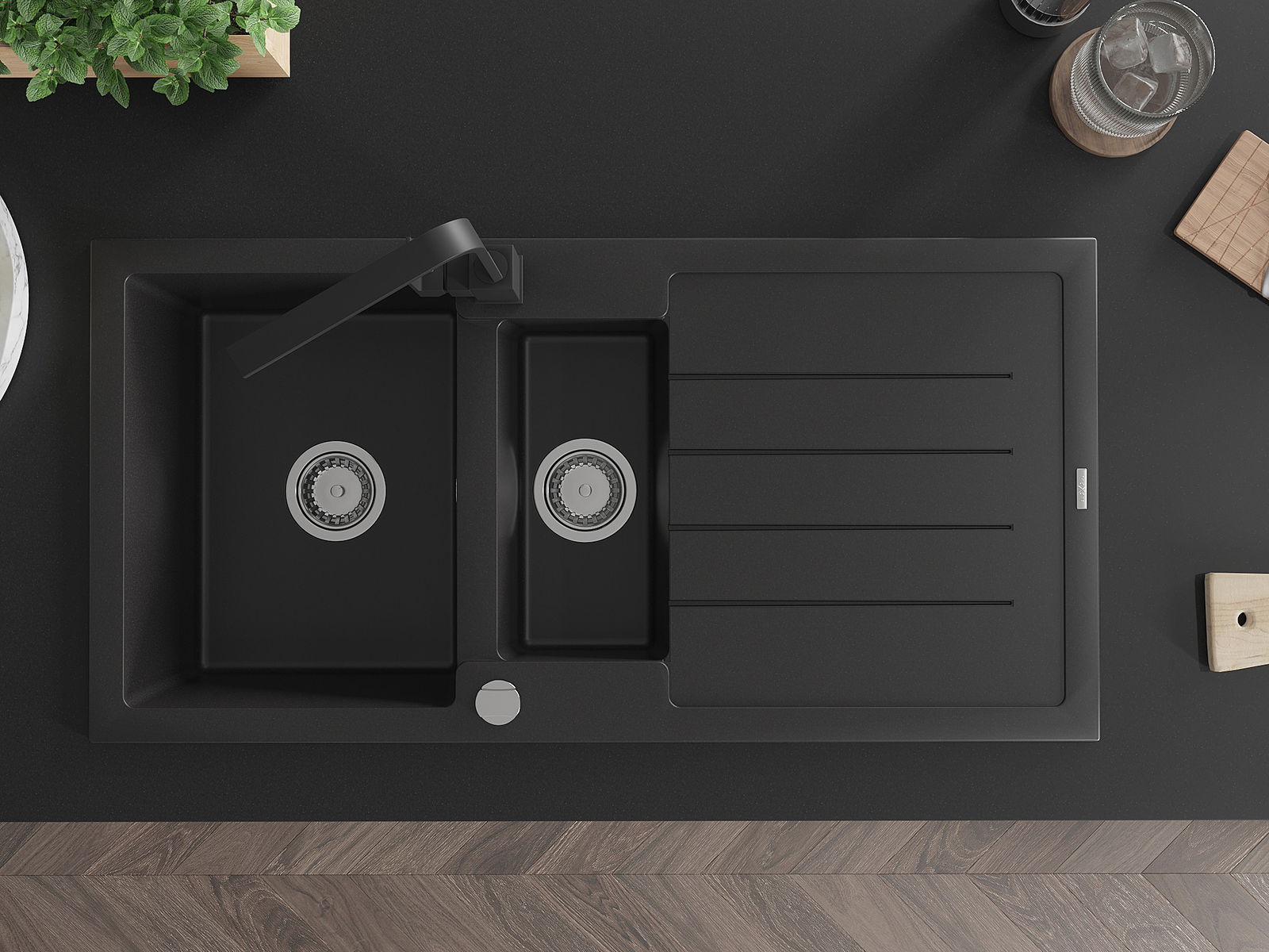 Dank des universellen Montagesystems ist die Spüle reversibel und der Abfluss kann links oder rechts auf der Theke montiert werden. Auf diese Weise können Sie die Seite einfach an Ihre Bedürfnisse und Bedingungen einstellen.