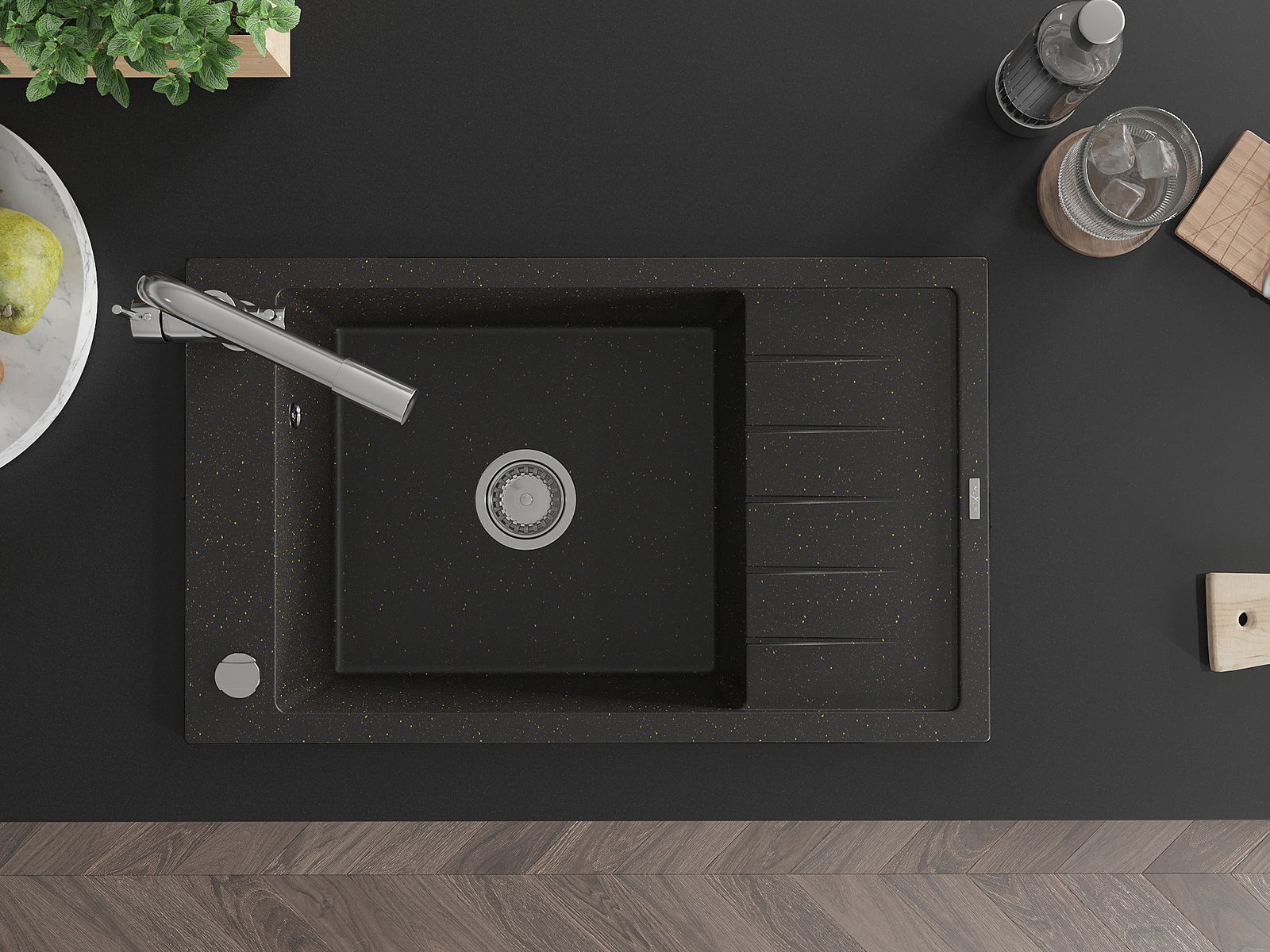 Die Spüle besteht aus hochwertigem Granit. Es ist eine elegante und vor allem praktische Ergänzung zu jeder Küche, unabhängig von ihrem Stil. Hohe Qualität und Granitdauer sorgen für eine langjährige Nutzung.