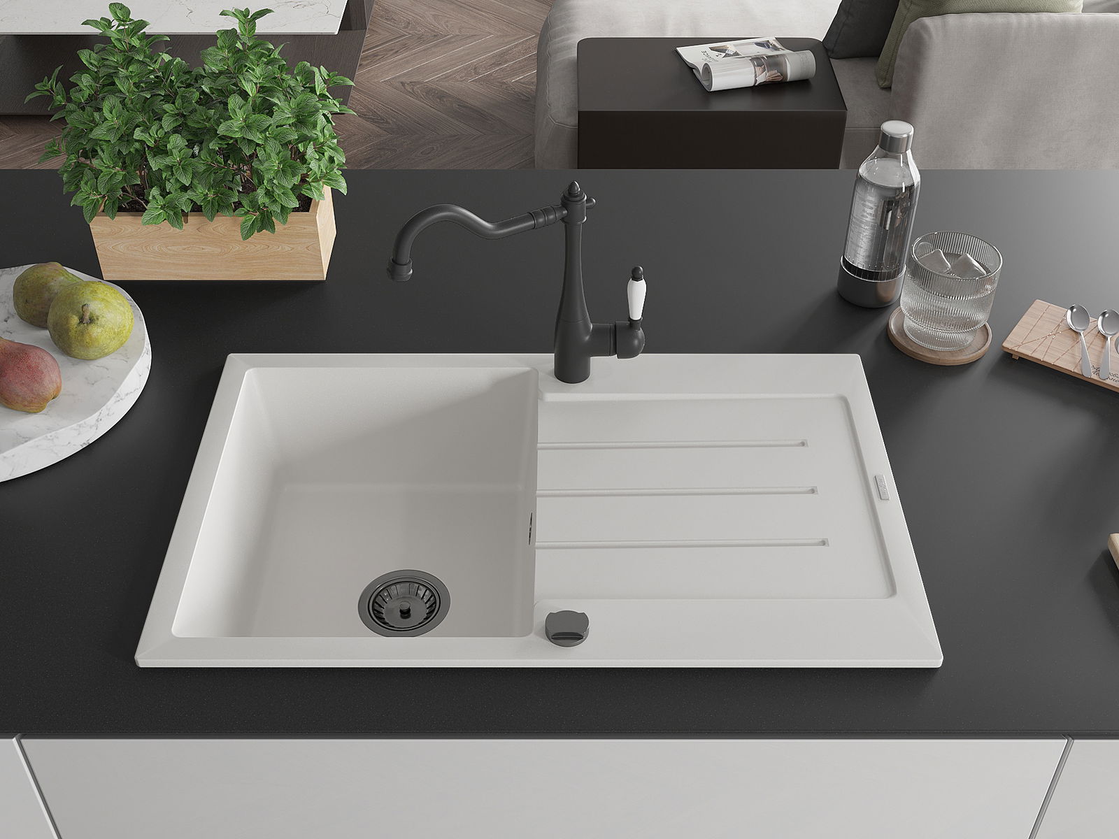 Die Spüle besteht aus hochwertigem Granit. Es ist eine elegante und vor allem praktische Ergänzung zu jeder Küche, unabhängig von ihrem Stil. Hohe Qualität und Granitdauer sorgen für eine langjährige Nutzung.
