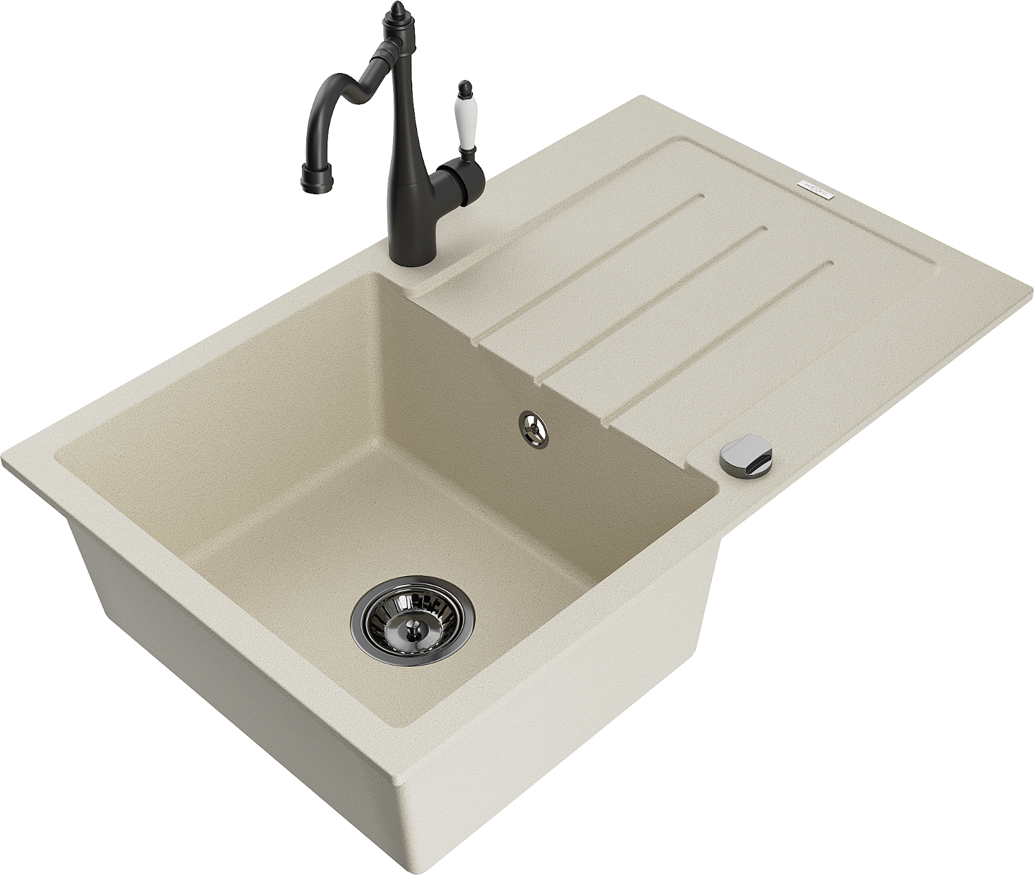 Mexen Bruno Granitspüle mit 1 Becken, Abtropffläche und Küchenarmatur Carla, beige - 6513-69-670700-70