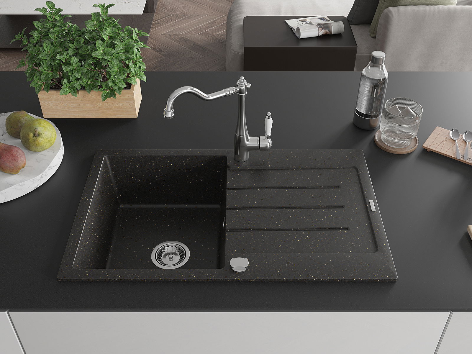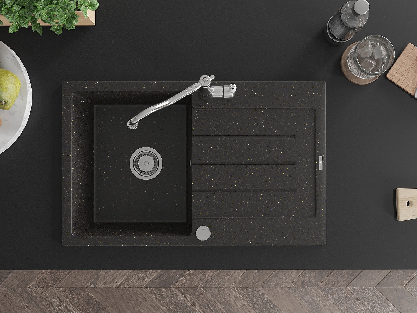 Mexen Bruno Granitspüle 1-Becken mit Abtropffläche und Küchenbatterie Carla, schwarz/gold metallic - 6513-75-670700-00
