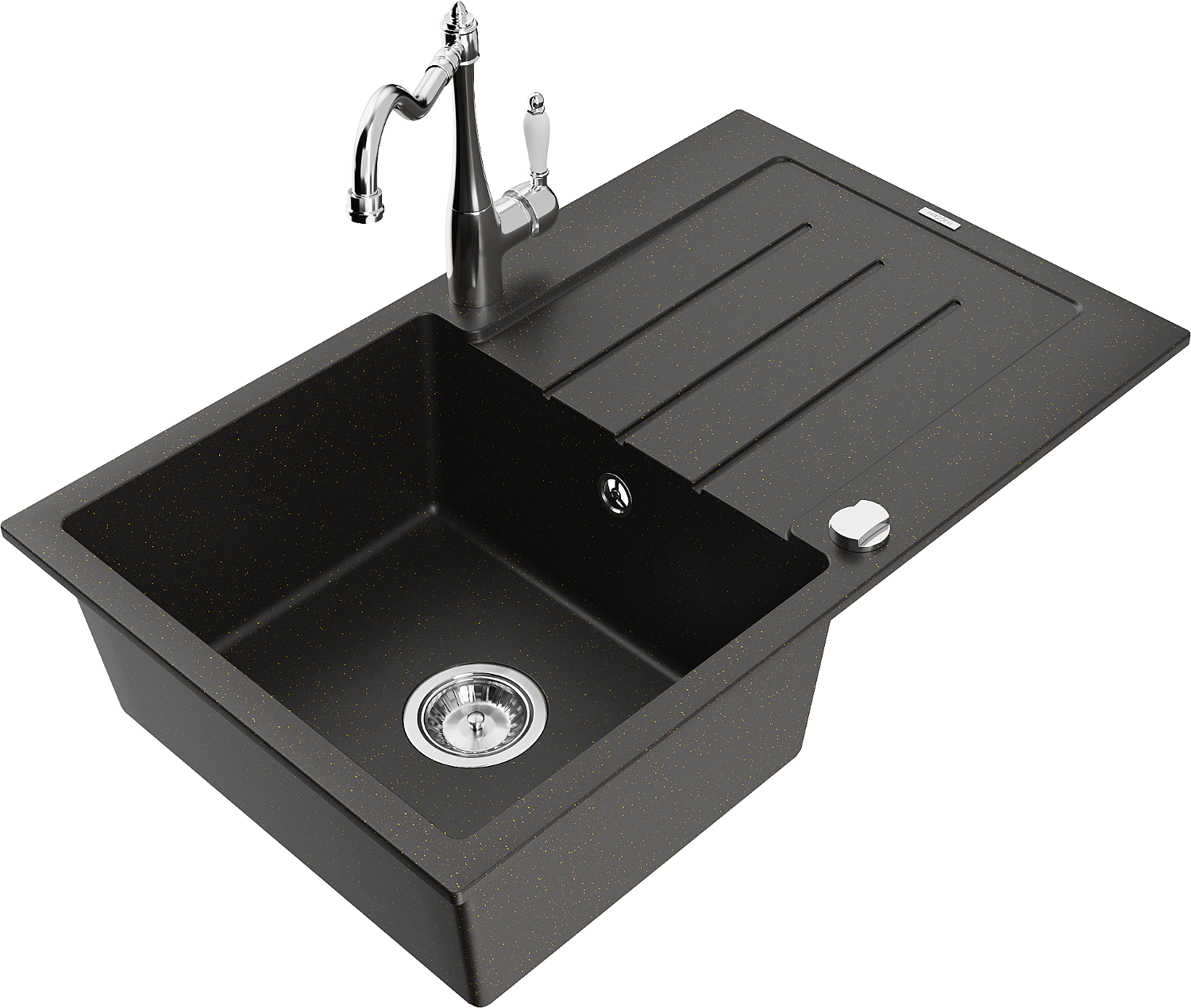 Die Spüle besteht aus hochwertigem Granit. Es ist eine elegante und vor allem praktische Ergänzung zu jeder Küche, unabhängig von ihrem Stil. Hohe Qualität und Granitdauer sorgen für eine langjährige Nutzung.