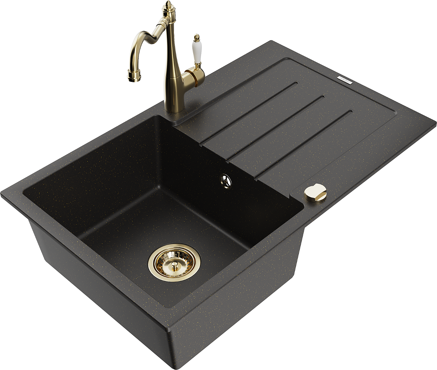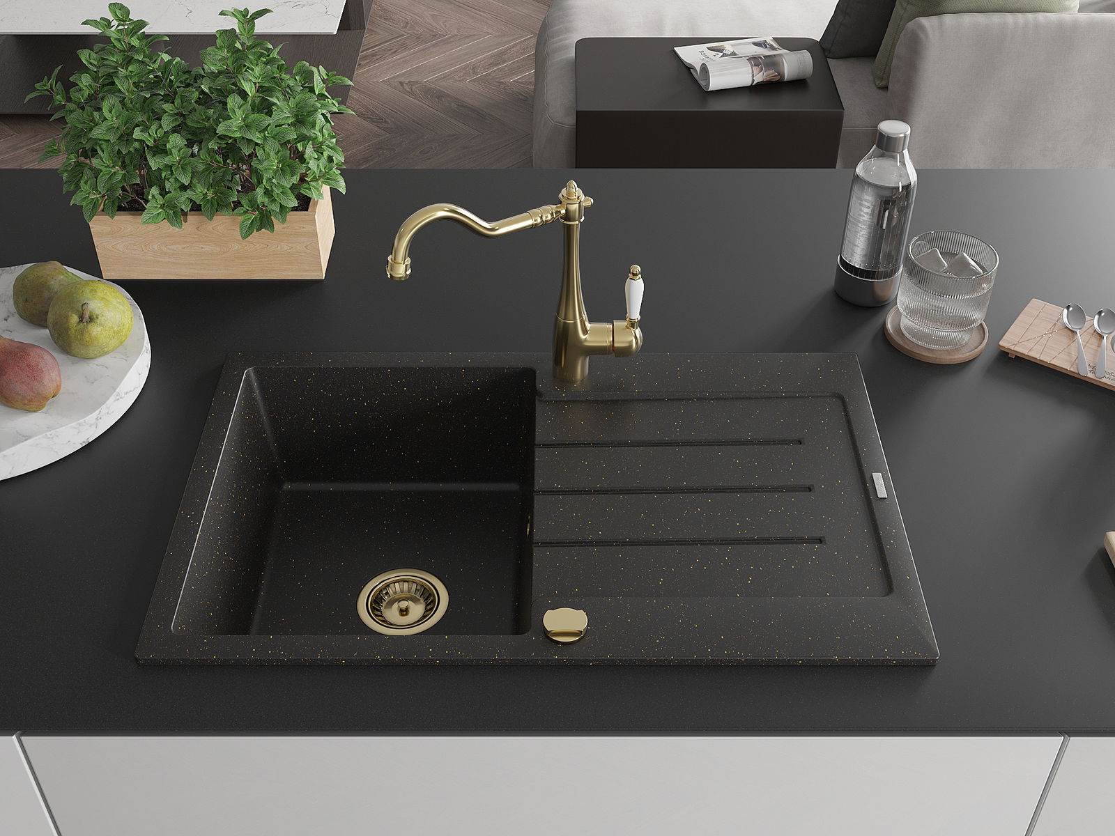 Mexen Bruno Granitspüle mit 1 Becken, Abtropffläche und Küchenarmatur Carla, schwarz/gold metallic - 6513-75-670700-50