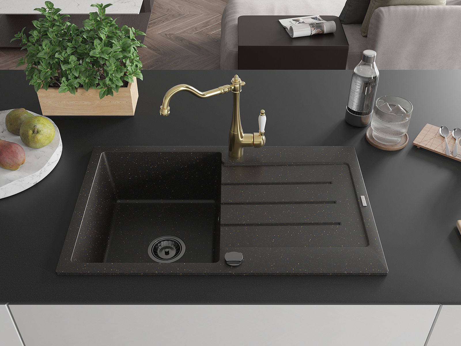 Mexen Bruno Granitspüle 1-Becken mit Abtropffläche und Küchenarmatur Carla, Schwarz/Gold Metallic - 6513-75-670700-50-B
