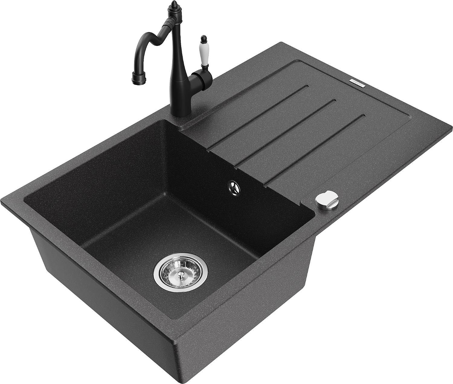 Die Spüle besteht aus hochwertigem Granit. Es ist eine elegante und vor allem praktische Ergänzung zu jeder Küche, unabhängig von ihrem Stil. Hohe Qualität und Granitdauer sorgen für eine langjährige Nutzung.