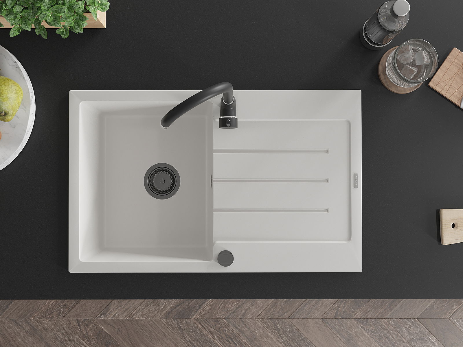 Die Spüle besteht aus hochwertigem Granit. Es ist eine elegante und vor allem praktische Ergänzung zu jeder Küche, unabhängig von ihrem Stil. Hohe Qualität und Granitdauer sorgen für eine langjährige Nutzung.