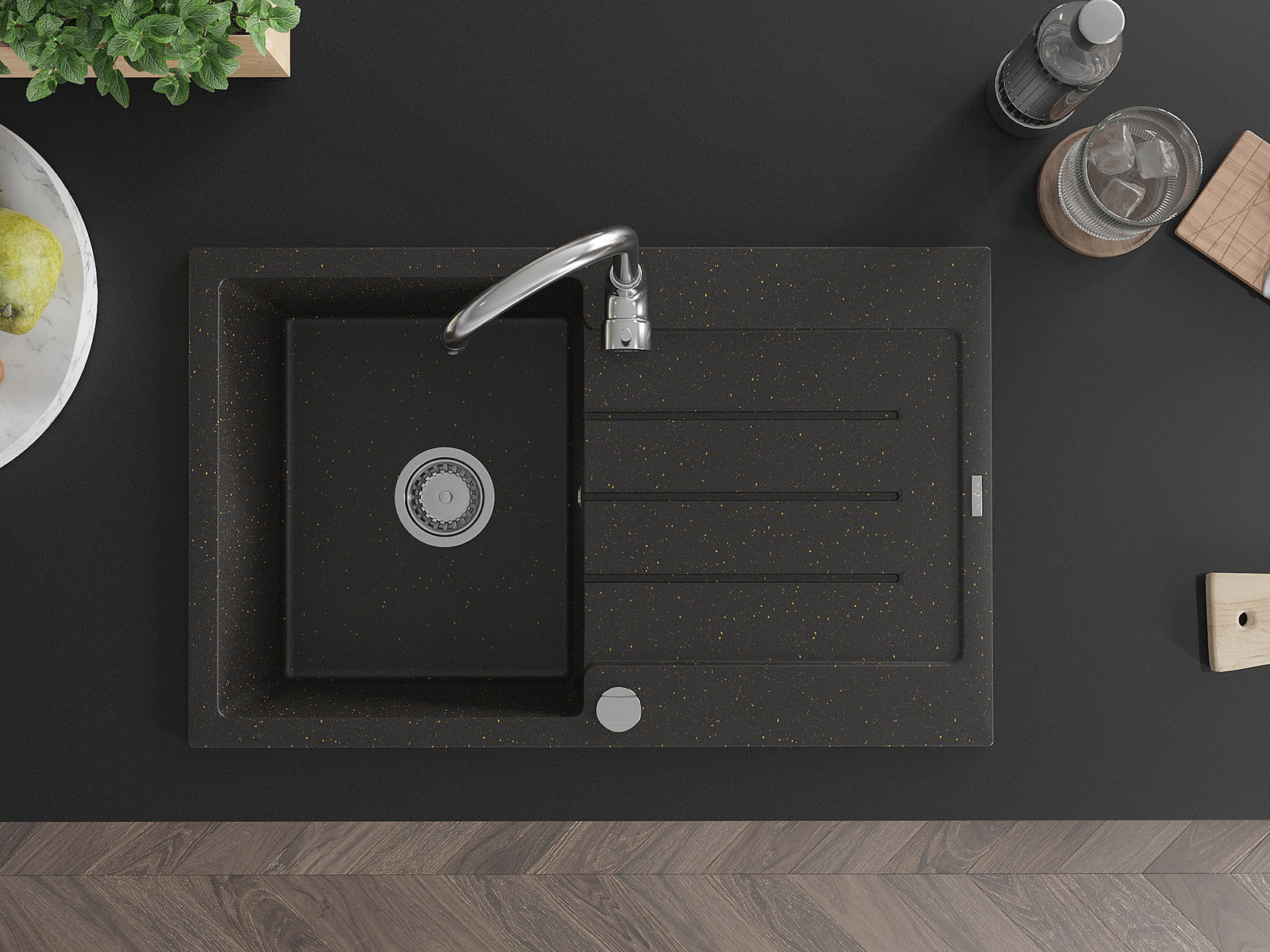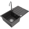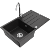 Die Spüle besteht aus hochwertigem Granit. Es ist eine elegante und vor allem praktische Ergänzung zu jeder Küche, unabhängig von ihrem Stil. Hohe Qualität und Granitdauer sorgen für eine langjährige Nutzung.