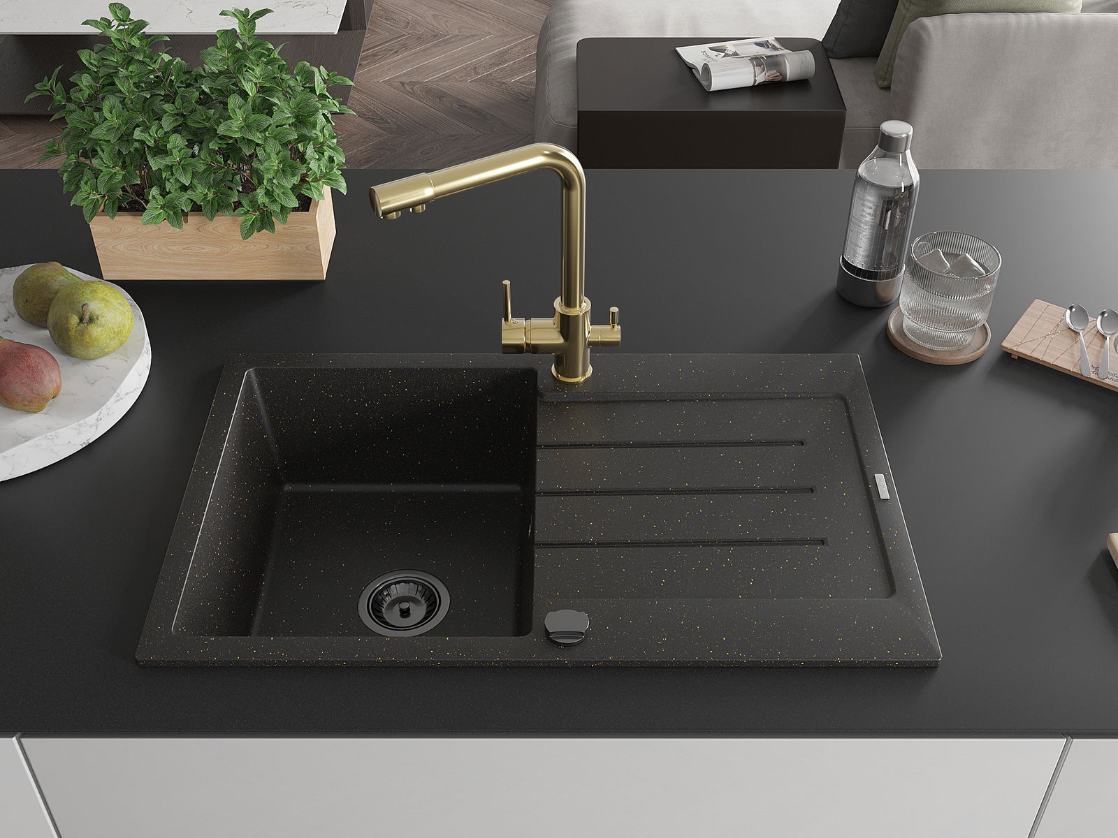 Mexen Bruno Granitspüle 1-Kammer mit Abtropffläche und Küchenarmatur Duero, schwarz/gold Metallic - 6513-75-671600-50-B