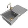 Die Spüle besteht aus hochwertigem Granit. Es ist eine elegante und vor allem praktische Ergänzung zu jeder Küche, unabhängig von ihrem Stil. Hohe Qualität und Granitdauer sorgen für eine langjährige Nutzung.