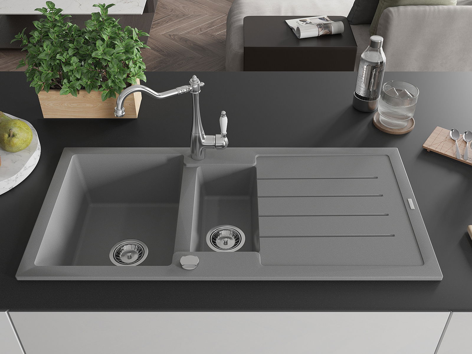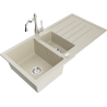 Die Spüle besteht aus hochwertigem Granit. Es ist eine elegante und vor allem praktische Ergänzung zu jeder Küche, unabhängig von ihrem Stil. Hohe Qualität und Granitdauer sorgen für eine langjährige Nutzung.