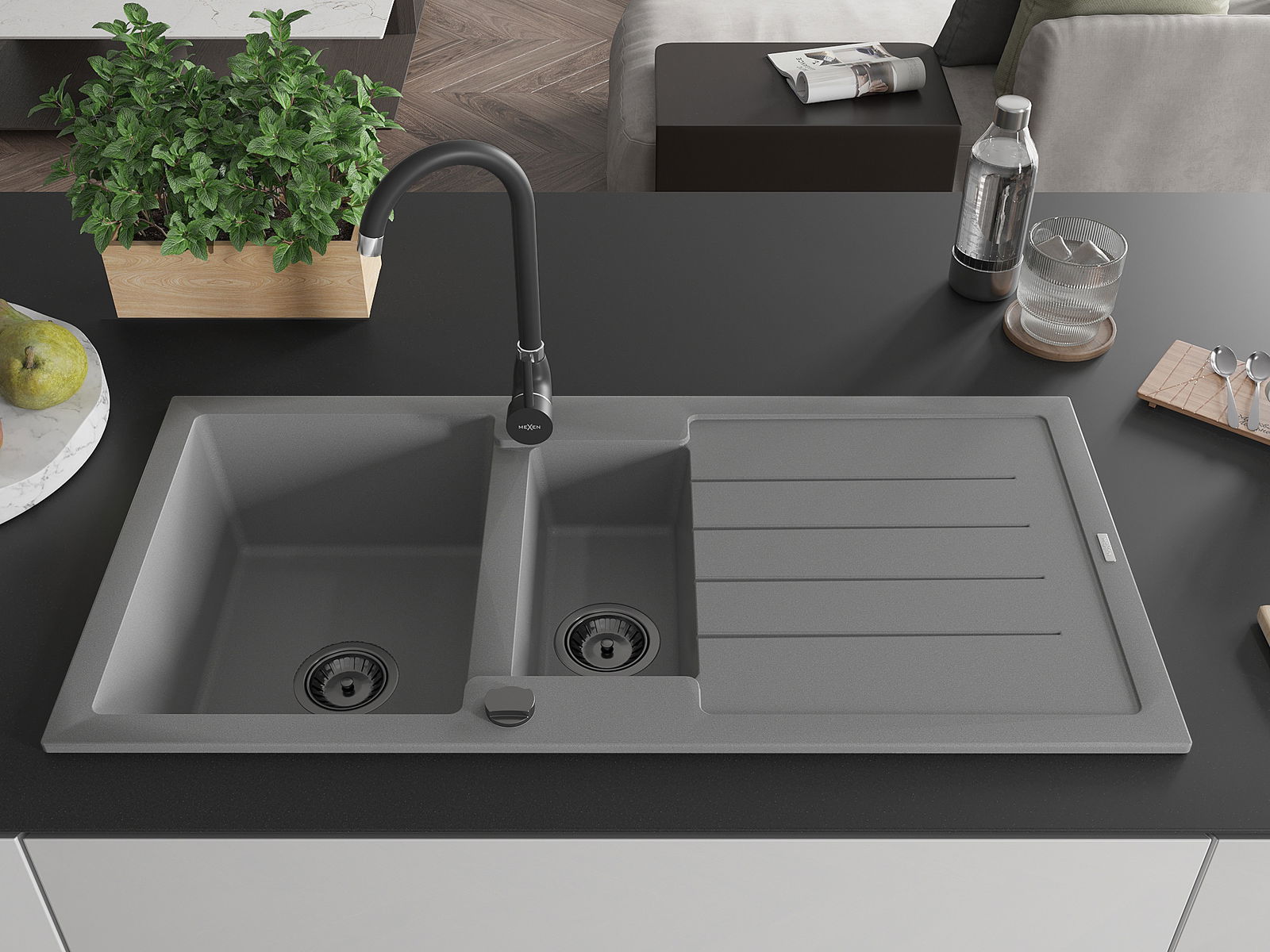 Die Spüle besteht aus hochwertigem Granit. Es ist eine elegante und vor allem praktische Ergänzung zu jeder Küche, unabhängig von ihrem Stil. Hohe Qualität und Granitdauer sorgen für eine langjährige Nutzung.
