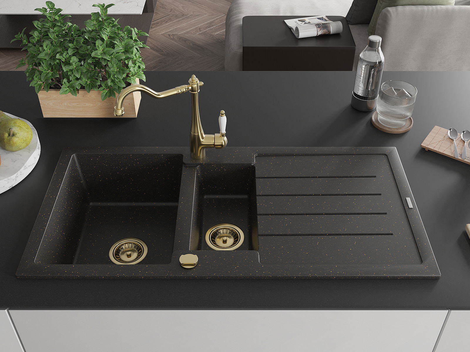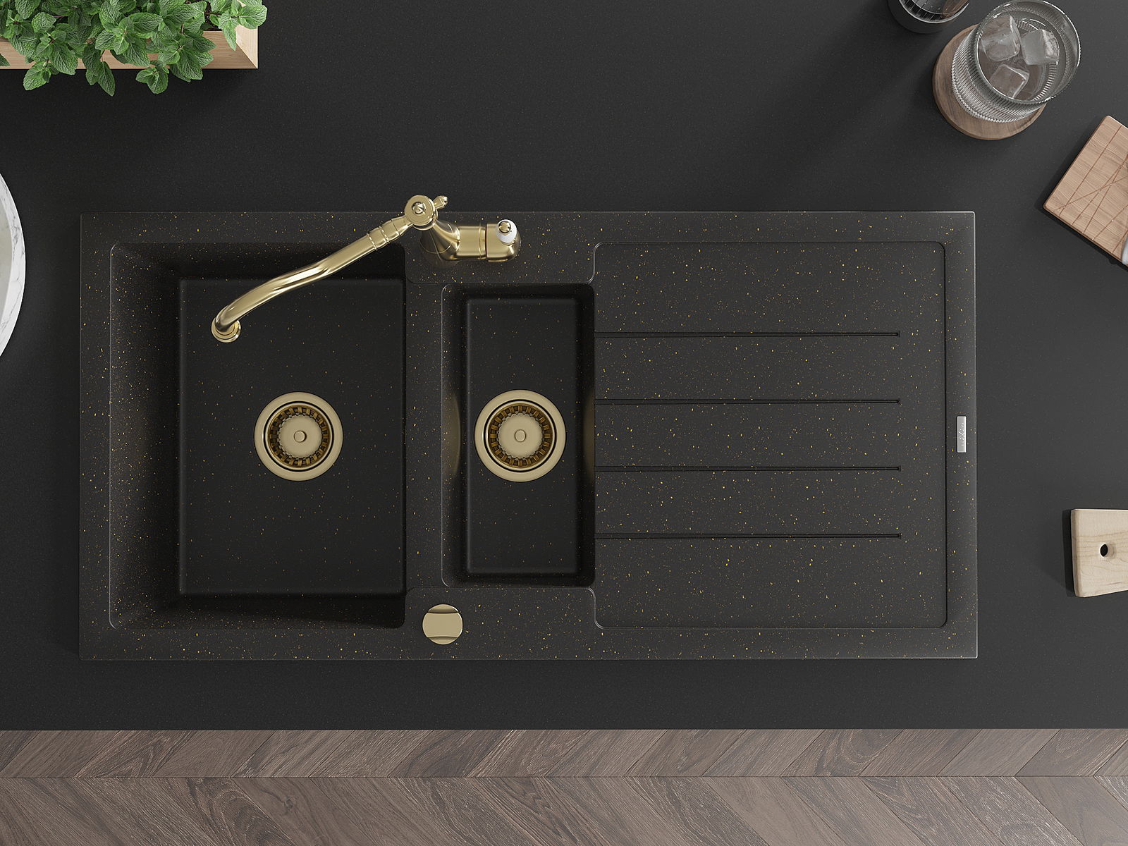 Mexen Andres Granitspüle 1,5-Kammern mit Abtropffläche und Küchenarmatur Carla, Schwarz/Gold Metallic - 6515-75-670700-50