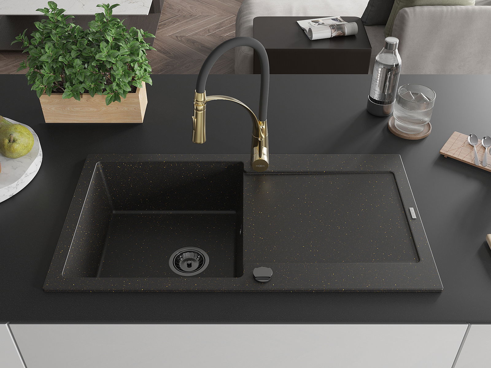 Mexen Leo Granitspüle 1-Becken mit Abtropffläche und Küchenarmatur Aster, schwarz/gold metallic - 6501-75-73450-57-B