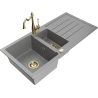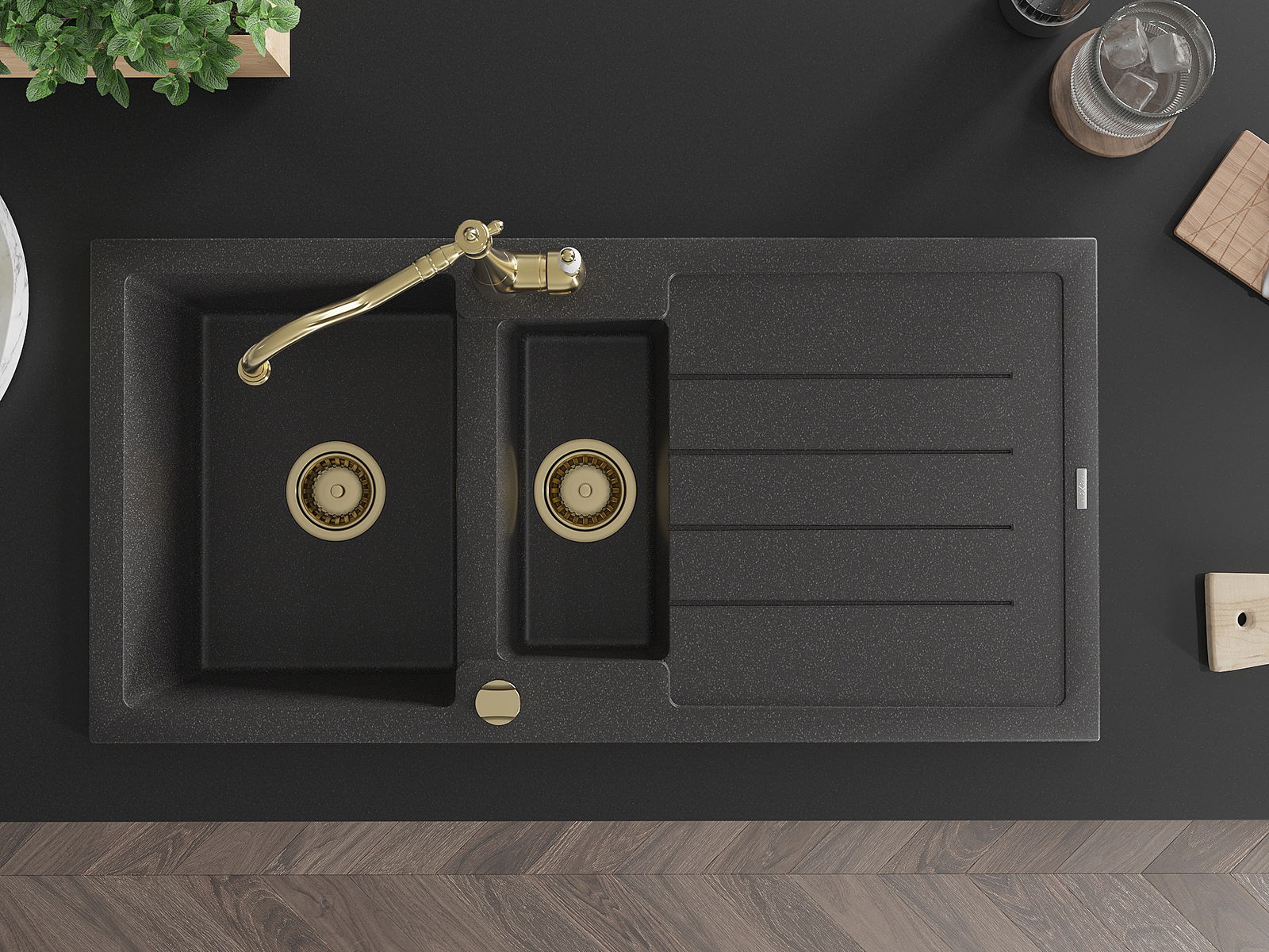 Mexen Andres Granitspüle 1,5-beckig mit Abtropffläche und Küchenarmatur Carla, schwarz gesprenkelt - 6515-76-670700-50