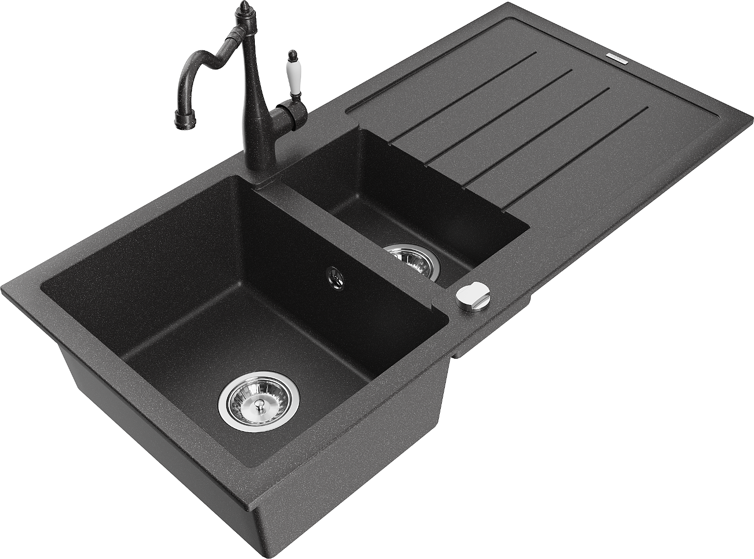 Mexen Andres Granitspüle 1,5-beckig mit Abtropffläche und Küchenarmatur Carla, schwarz gesprenkelt - 6515-76-670700-76