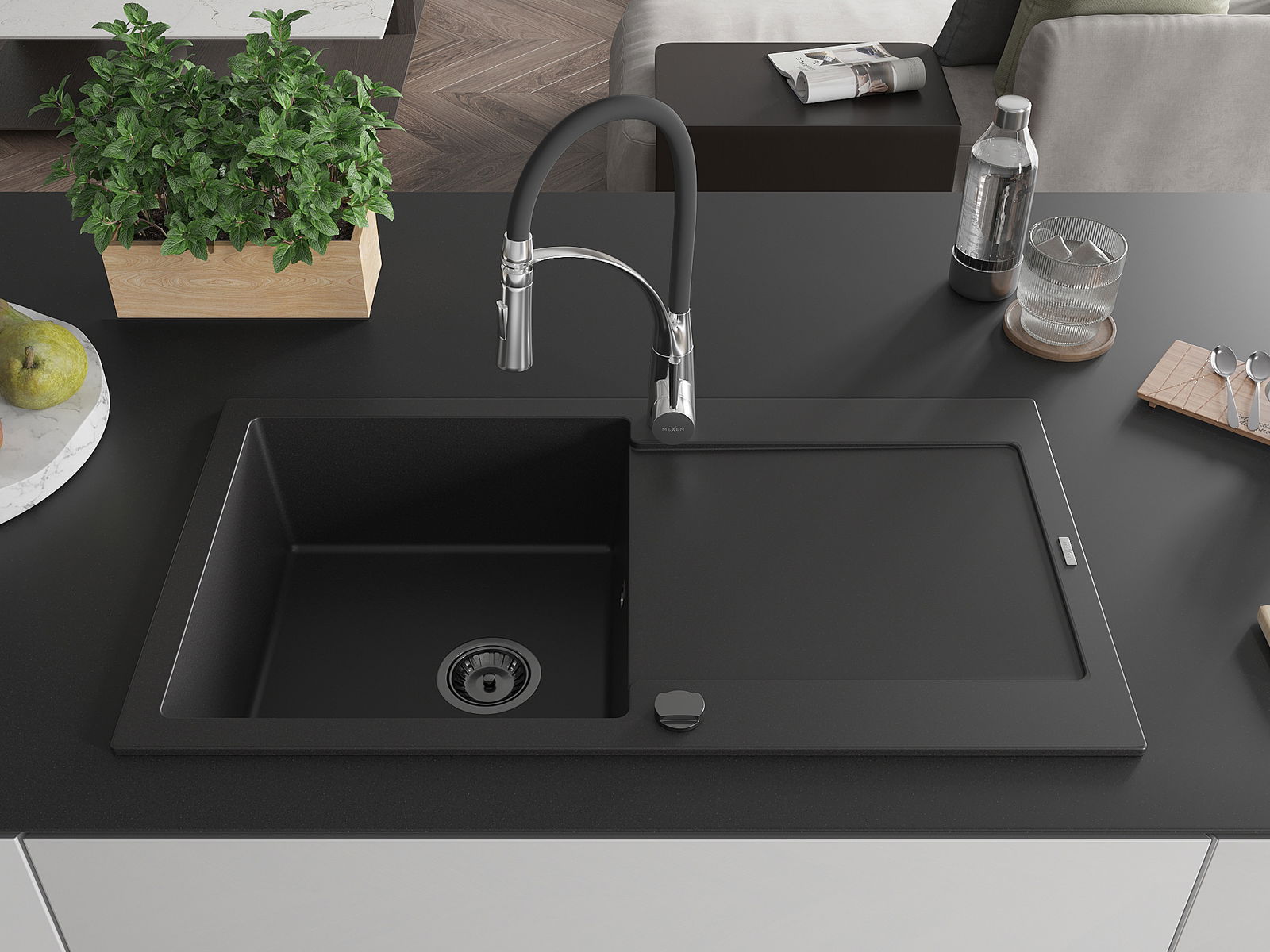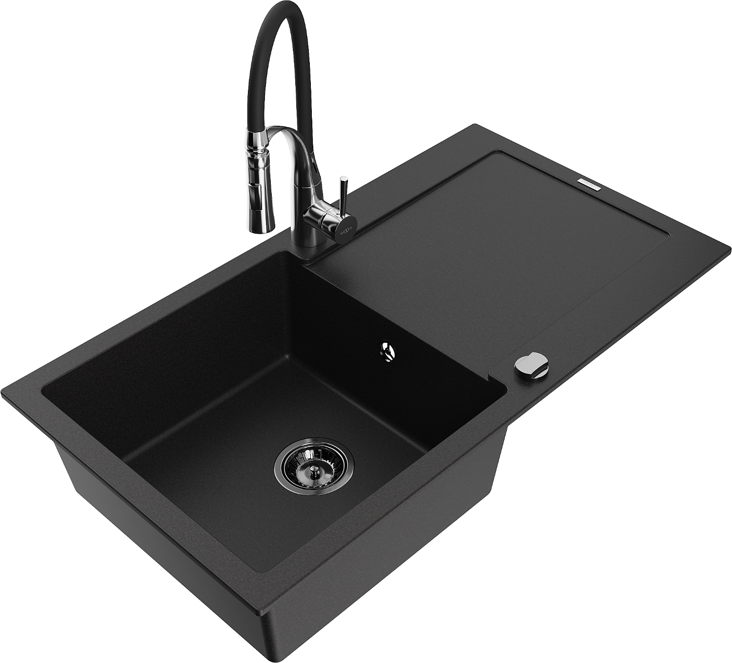 Mexen Leo Granitspüle 1-Becken mit Abtropffläche und Küchenarmatur Aster, Schwarz - 6501-77-73450-07-B