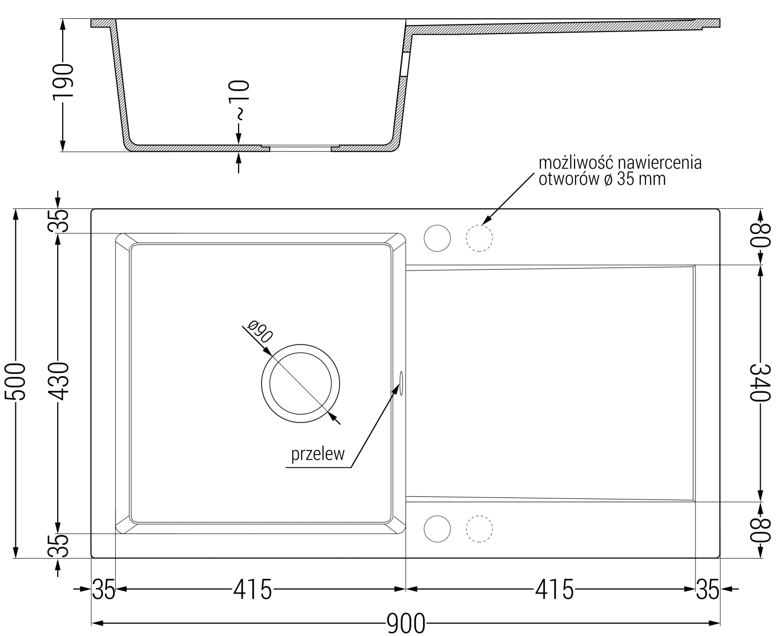 Das Spülbecken verfügt über 2 vorgefräste Öffnungen mit einem Durchmesser von 35 mm, die eigenständig ausgeschlagen werden können. Diese können unter anderem für die Montage eines Spenders für Flüssigkeiten genutzt werden, der das Vorhandensein von Plastikflaschen in der Küche eliminiert und ihr ein elegantes Finish verleiht.