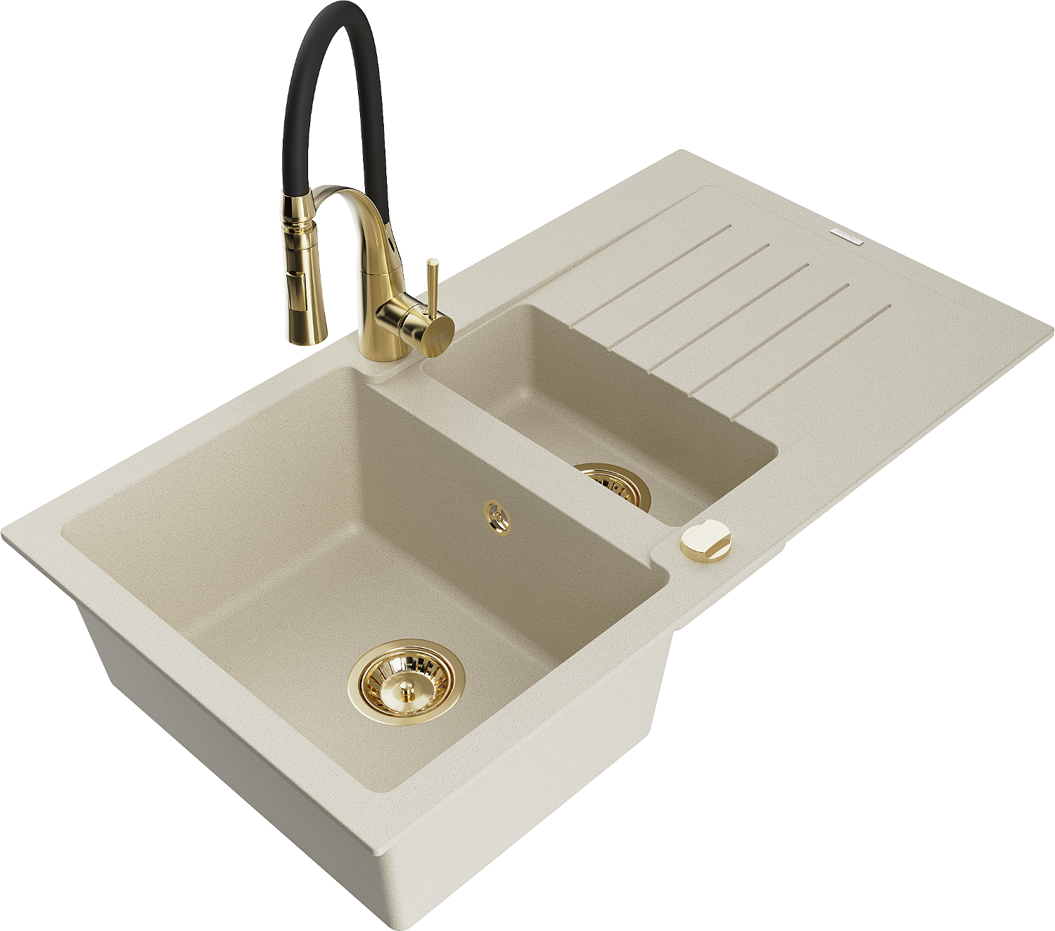Mexen Matias Granitspüle 1,5-Kammer mit Abtropffläche und Küchenarmatur Aster, beige - 6502-69-73450-57-G