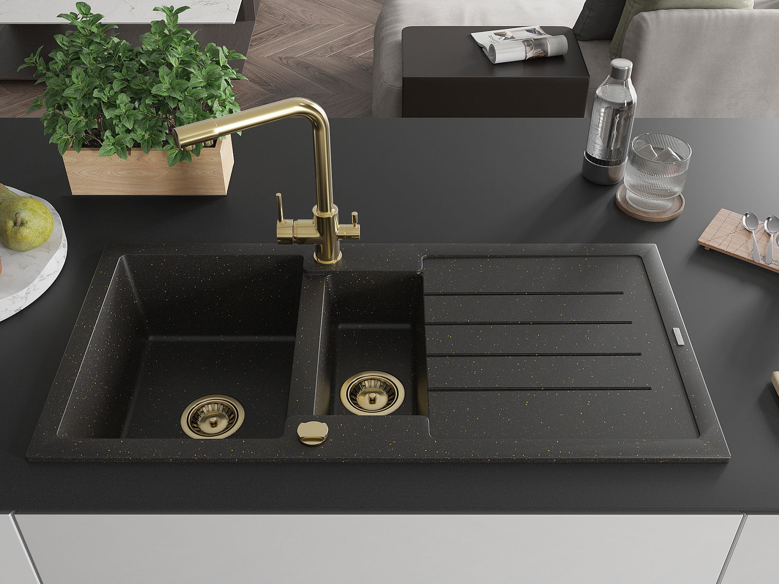 Mexen Andres 1,5-Kammer-Einbauspüle aus Granit mit Abtropffläche und Küchenarmatur Duero, schwarz/gold - 6515-75-671600-50