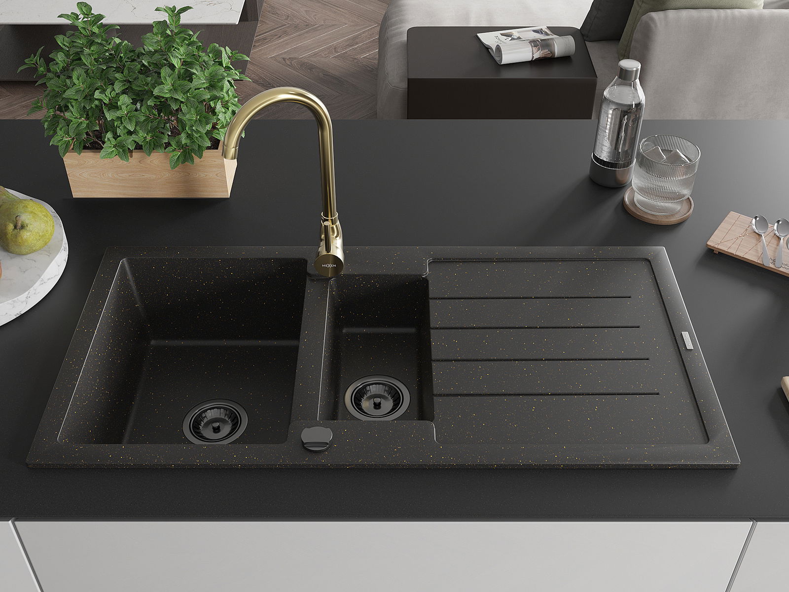 Mexen Andres 1,5-Kammer-Küchenspüle aus Granit mit Abtropffläche und Telma Küchenarmatur, schwarz/gold - 6515-75-670200-50-B