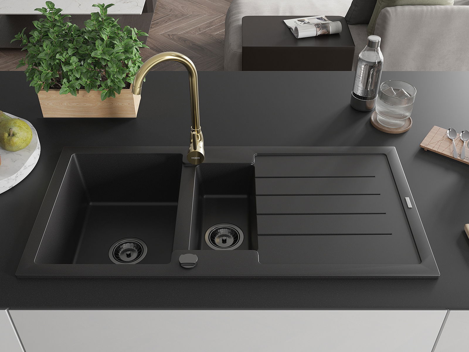 Mexen Andres Granit-Spüle 1,5-fach mit Abtropffläche und Küchenarmatur Telma, schwarz - 6515-77-670200-50-B
