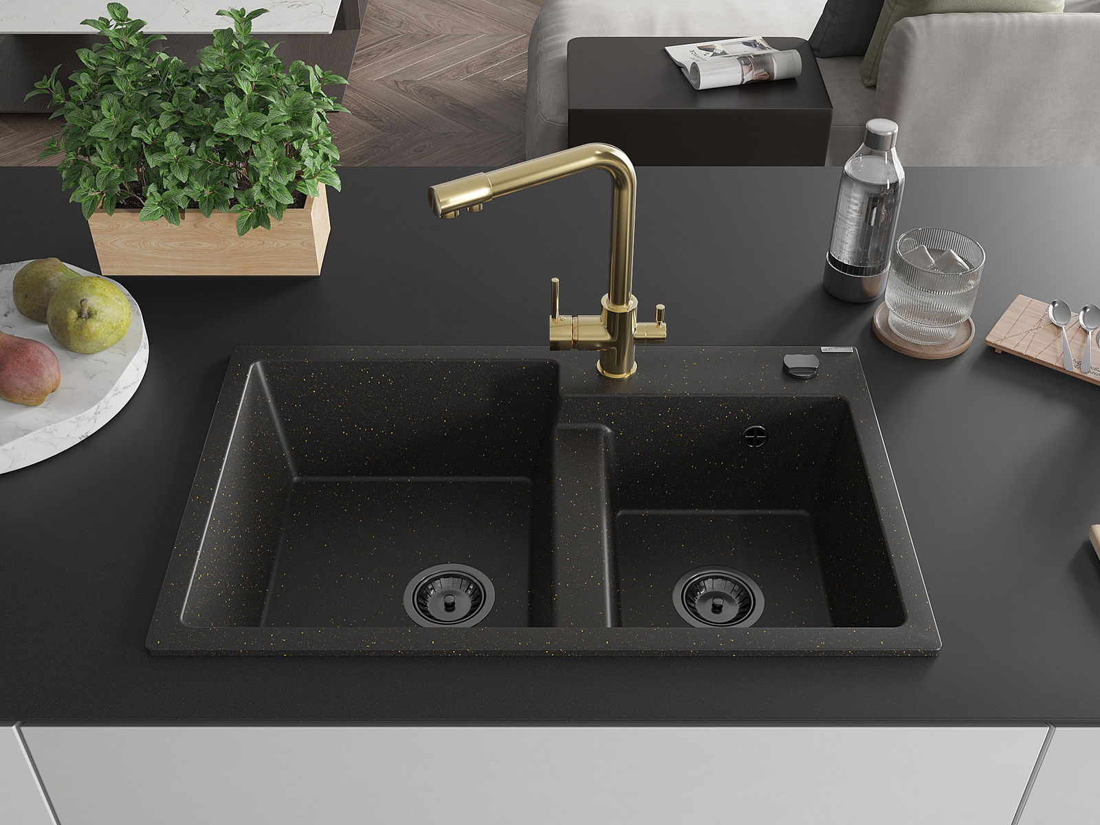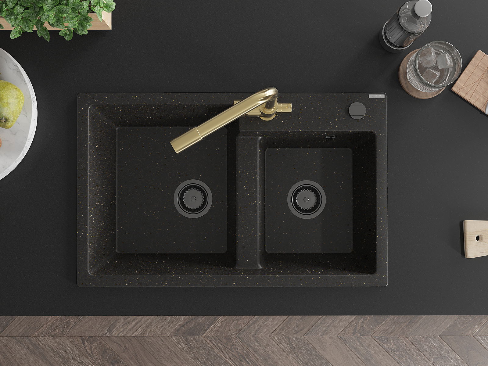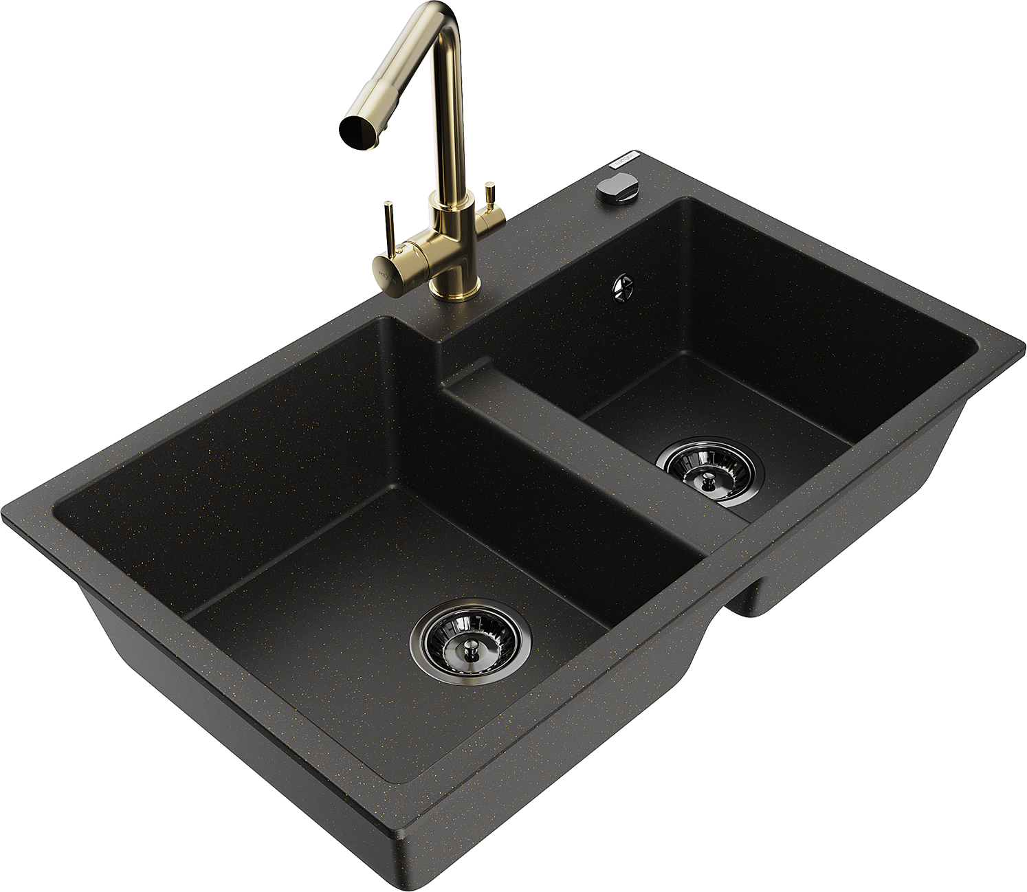 Mexen Tomas Granitspüle 2-Kammer mit Küchenarmatur Duero, schwarz/gold metallic - 6516-75-671600-50-B