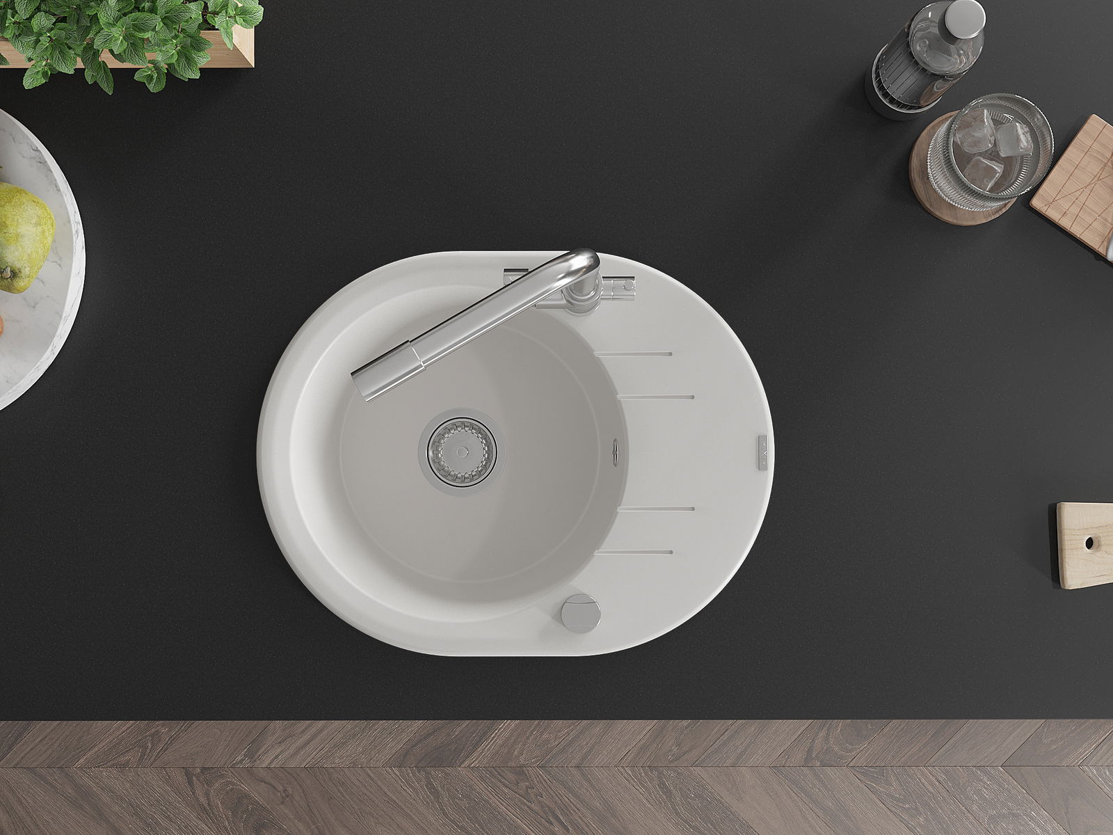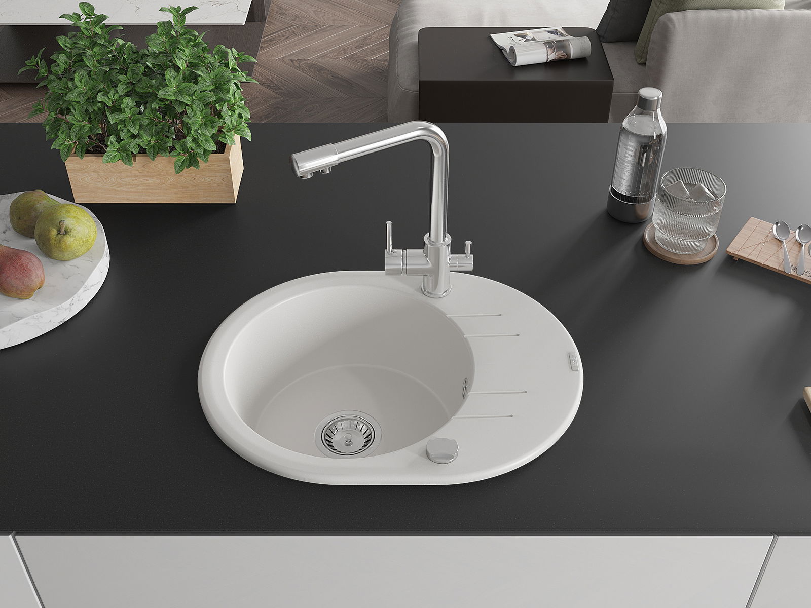 Die Spüle besteht aus hochwertigem Granit. Es ist eine elegante und vor allem praktische Ergänzung zu jeder Küche, unabhängig von ihrem Stil. Hohe Qualität und Granitdauer sorgen für eine langjährige Nutzung.