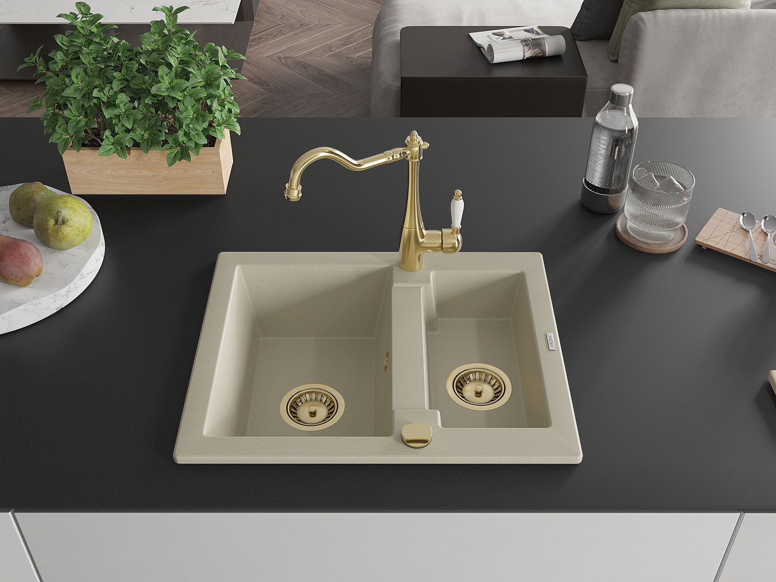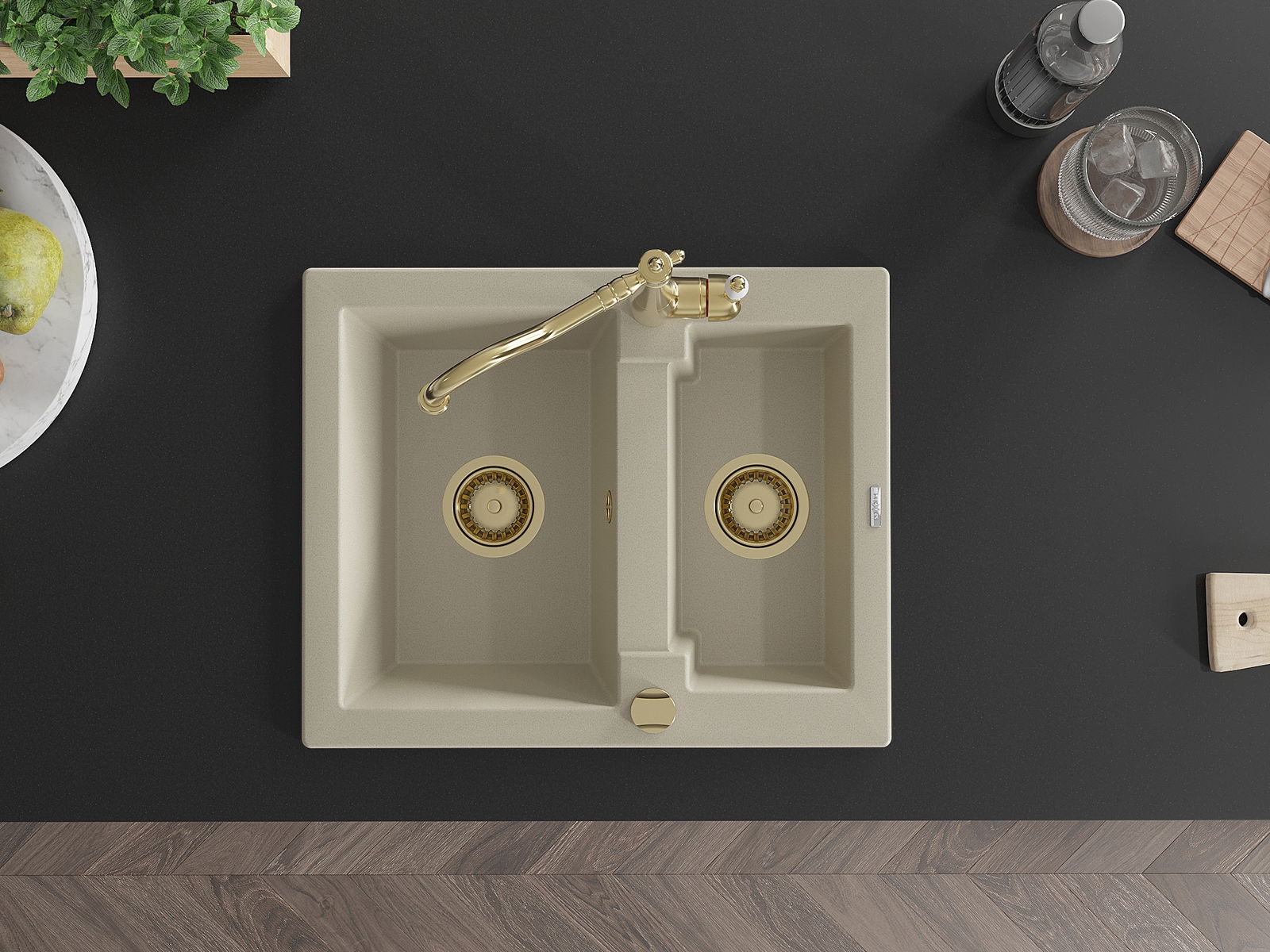 Die Spüle besteht aus hochwertigem Granit. Es ist eine elegante und vor allem praktische Ergänzung zu jeder Küche, unabhängig von ihrem Stil. Hohe Qualität und Granitdauer sorgen für eine langjährige Nutzung.