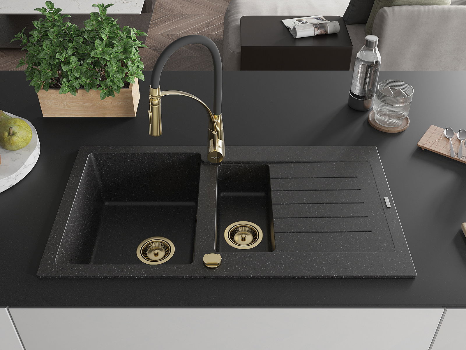 Die Spüle besteht aus hochwertigem Granit. Es ist eine elegante und vor allem praktische Ergänzung zu jeder Küche, unabhängig von ihrem Stil. Hohe Qualität und Granitdauer sorgen für eine langjährige Nutzung.