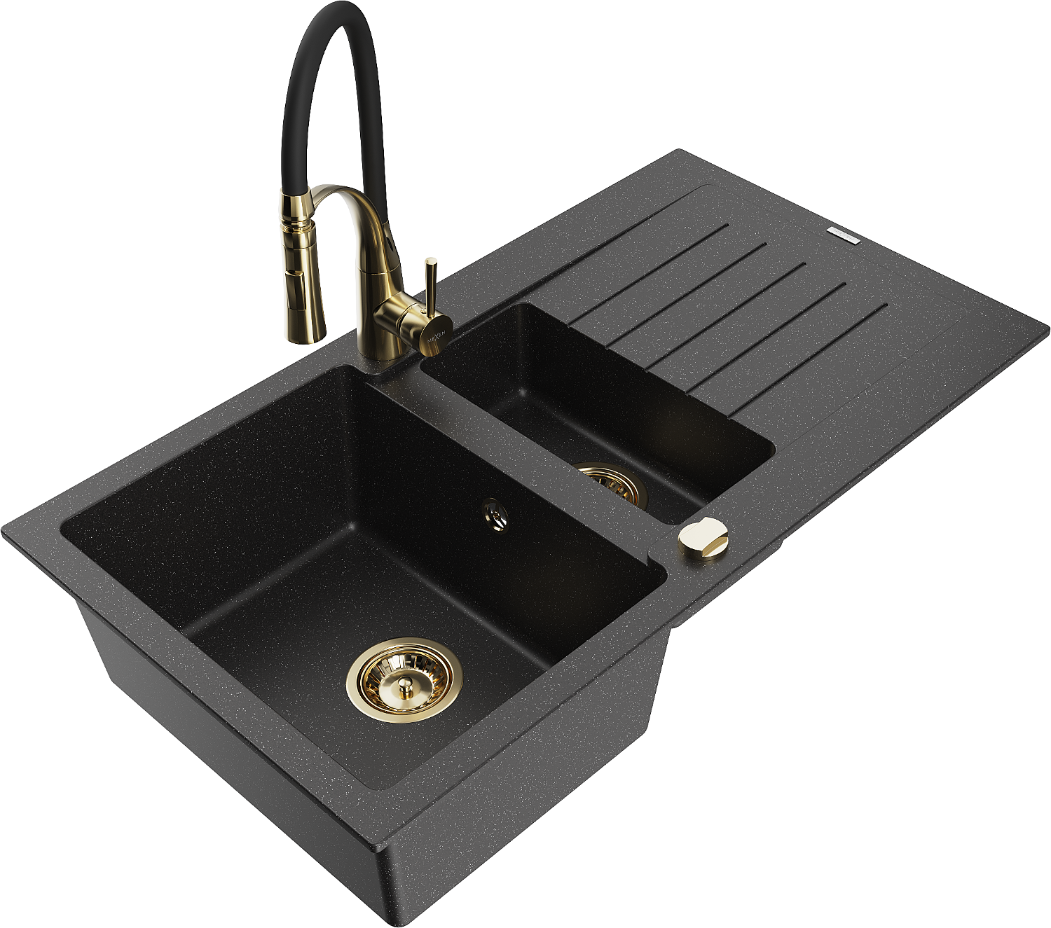 Mexen Matias Granitspüle 1,5-Becken mit Abtropffläche und Küchenarmatur Aster, schwarz/silber - 6502-73-73450-57-G
