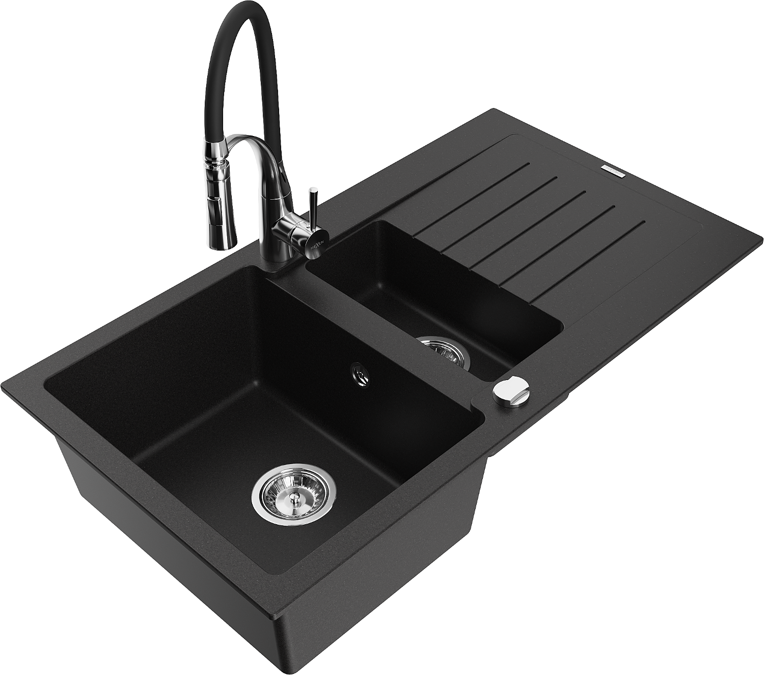 Mexen Matias Granitspüle 1,5-fach mit Abtropffläche und Küchenarmatur Aster, schwarz - 6502-77-73450-07