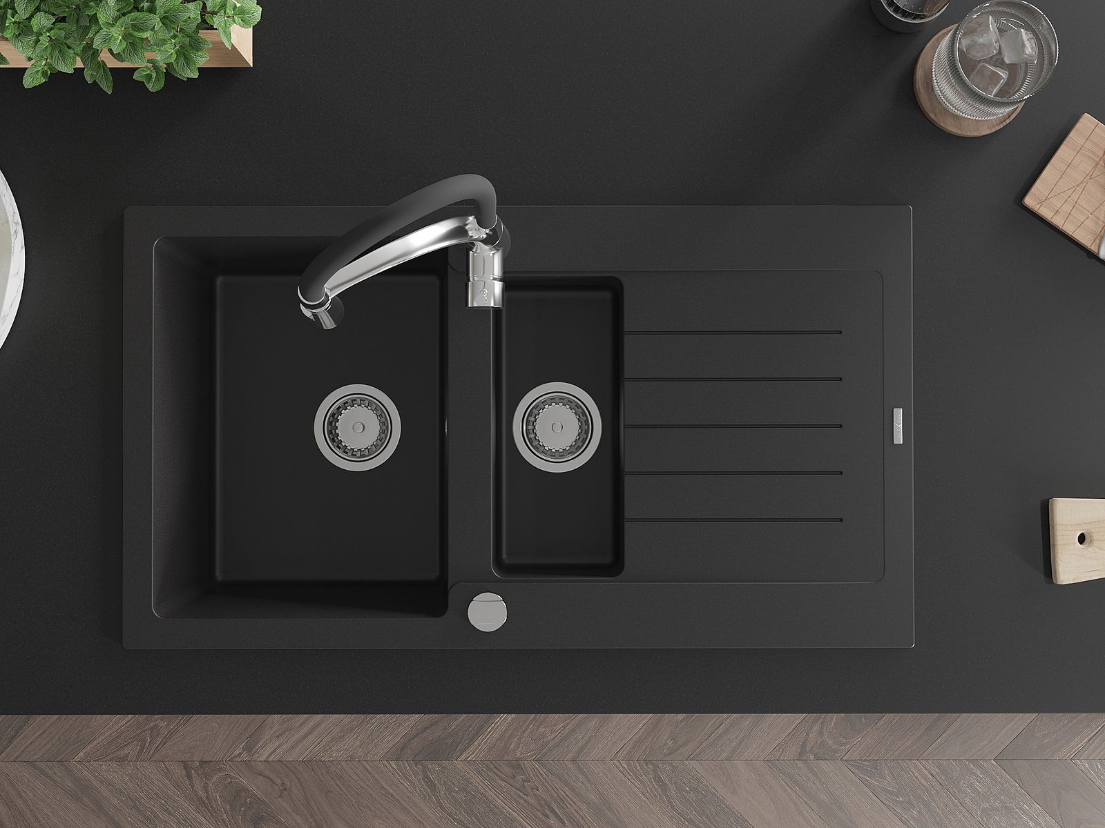 Dank des universellen Montagesystems ist die Spüle reversibel und der Abfluss kann links oder rechts auf der Theke montiert werden. Auf diese Weise können Sie die Seite einfach an Ihre Bedürfnisse und Bedingungen einstellen.