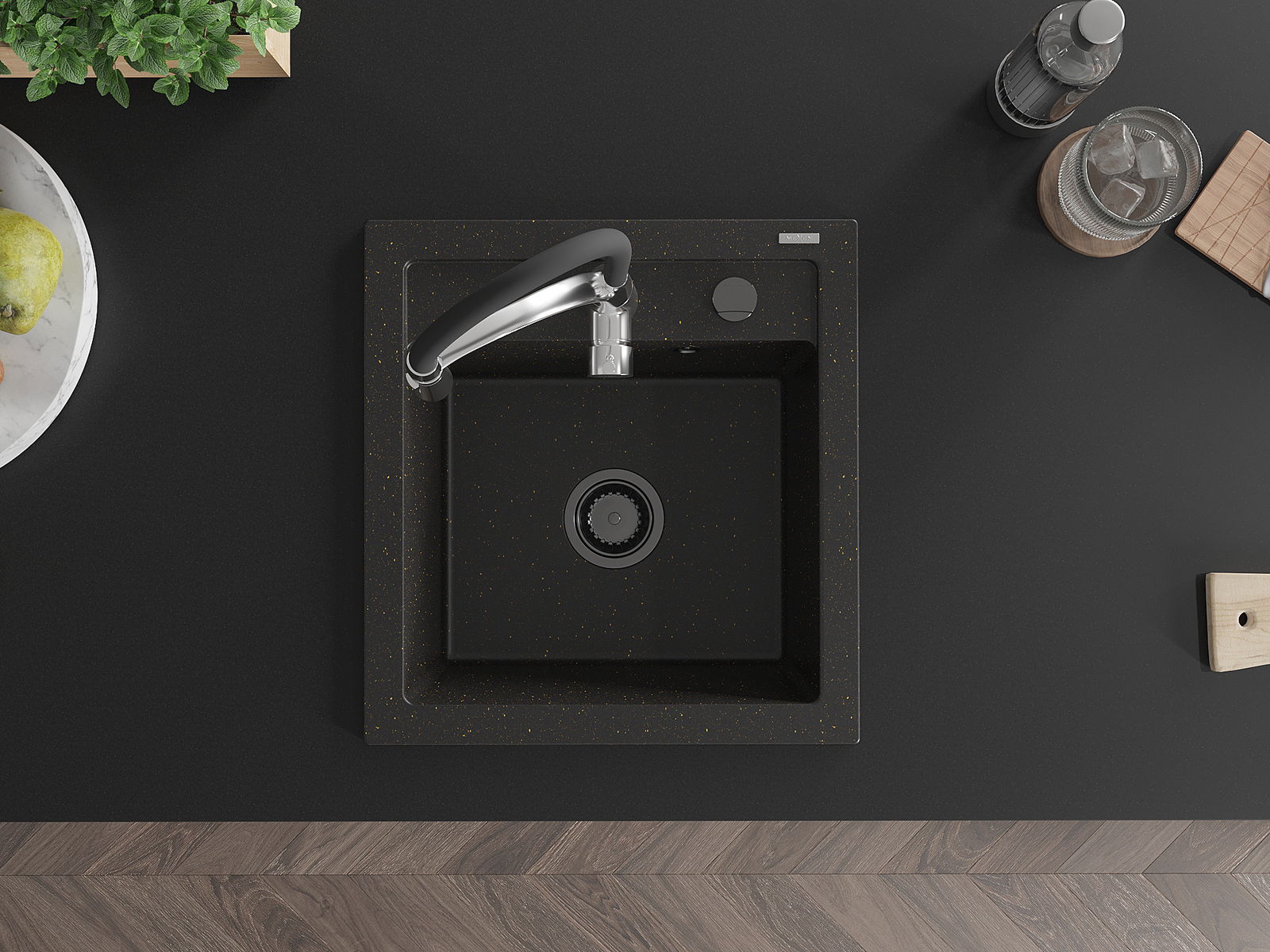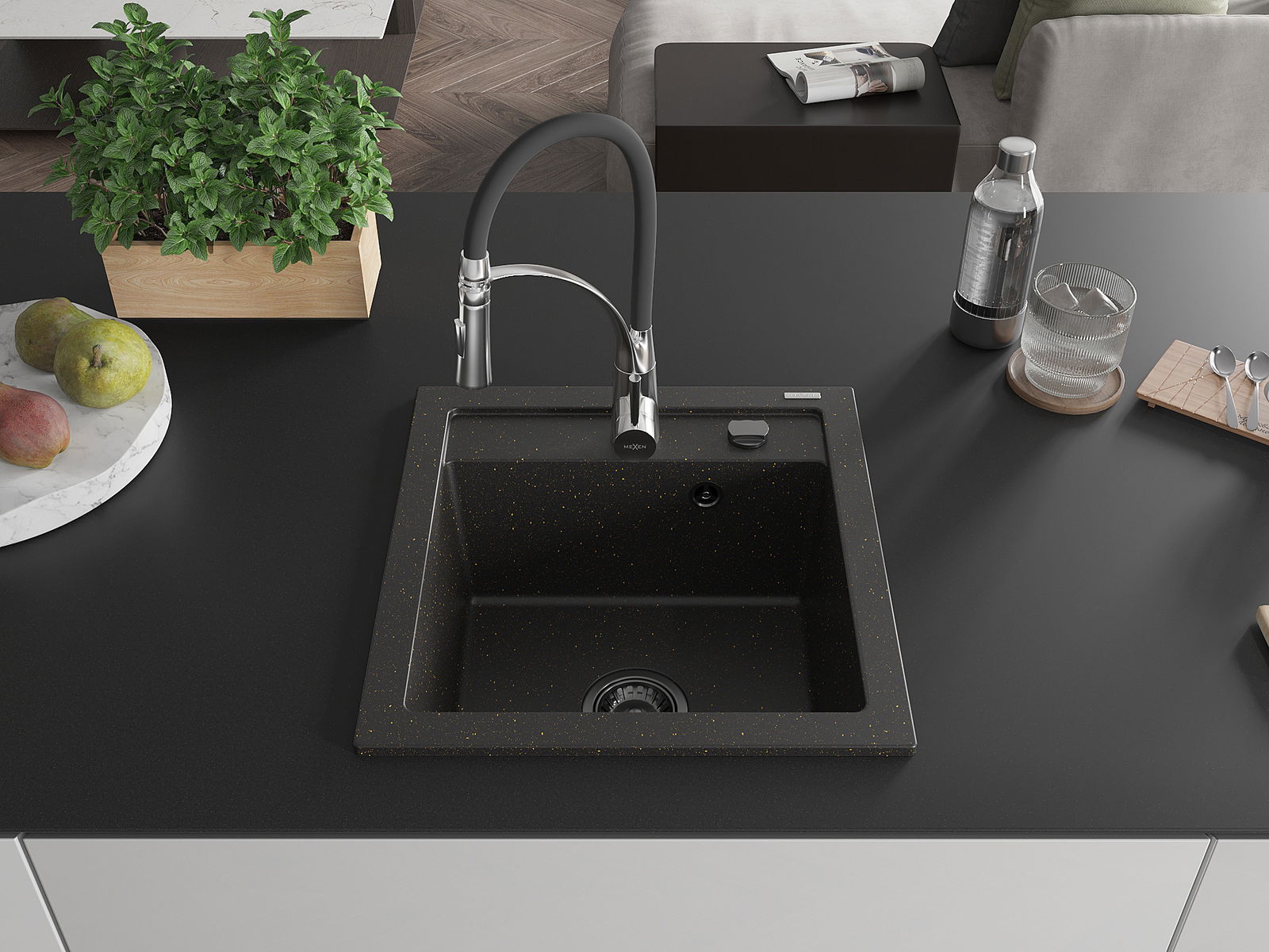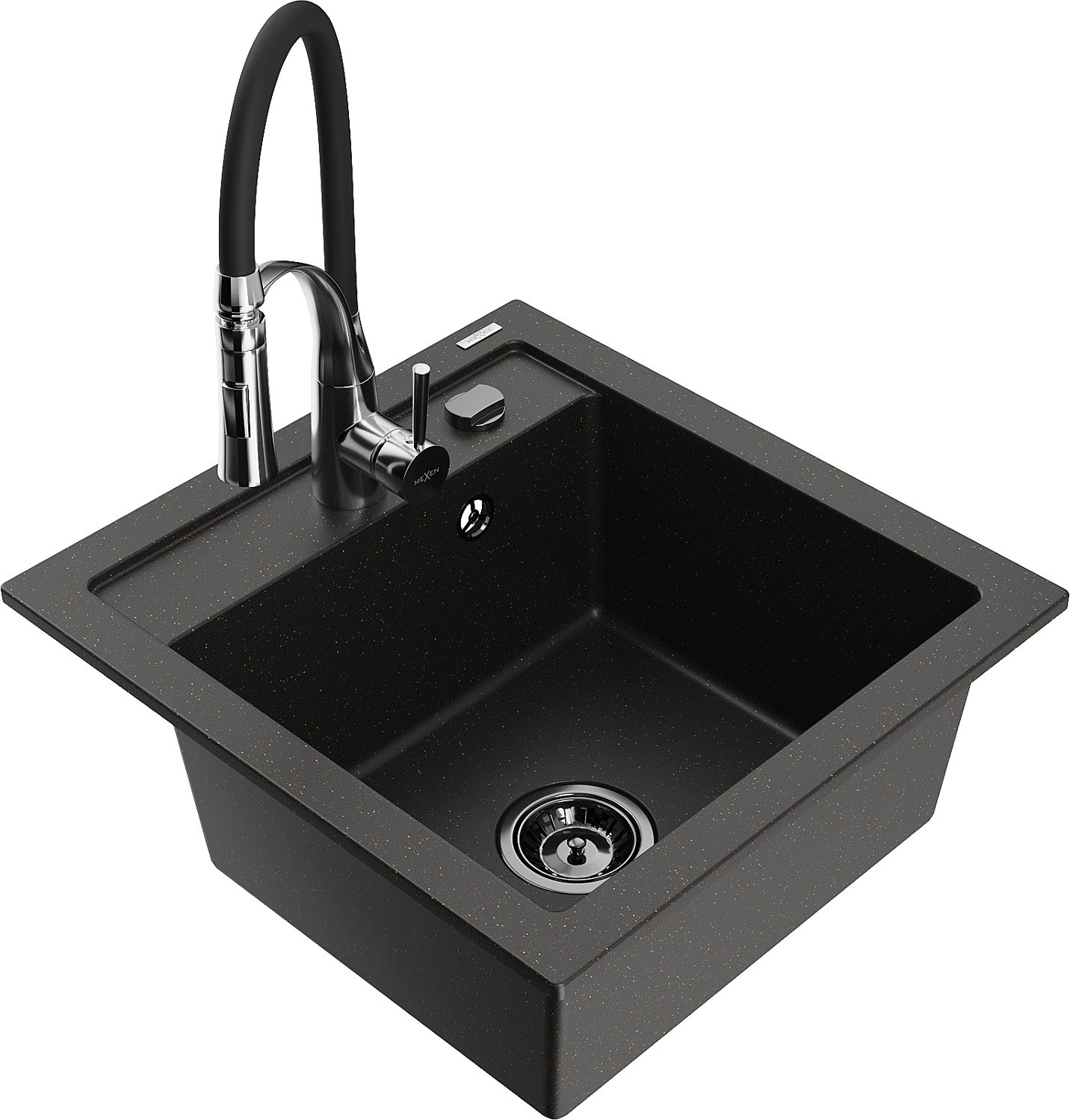Mexen Vito Granitspüle 1-Becken mit Küchenarmatur Aster, Schwarz/Gold Metallic- 6503-75-73450-07-B