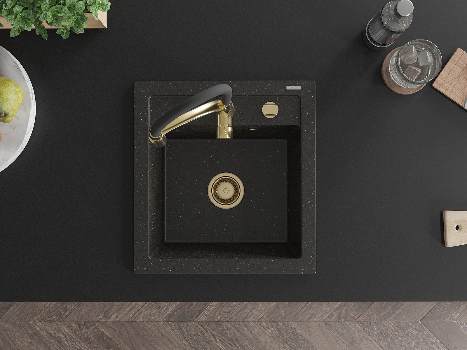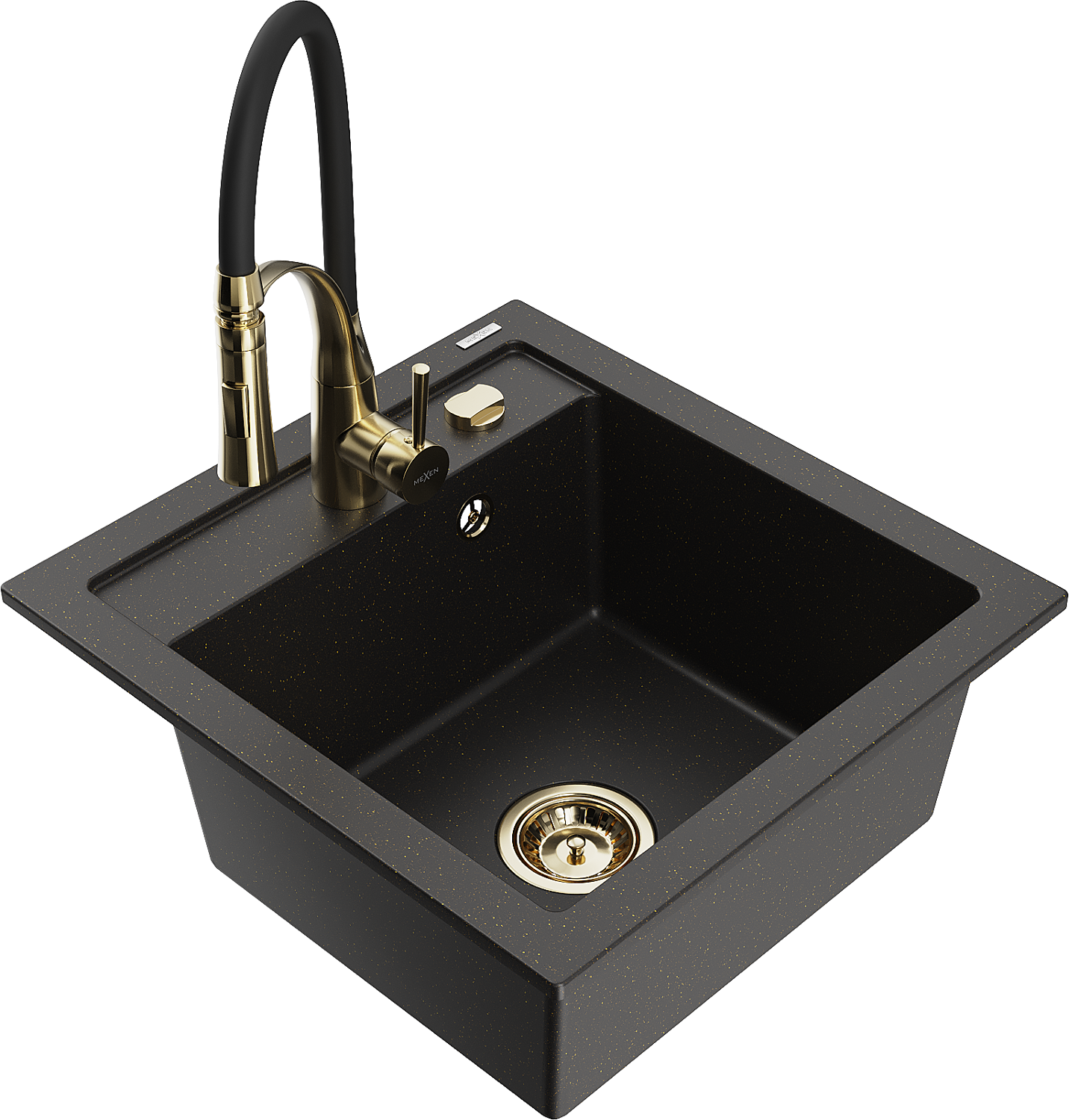 Mexen Vito Granitspüle 1-beckig mit Küchenarmatur Aster, schwarz/gold metallic- 6503-75-73450-57-G