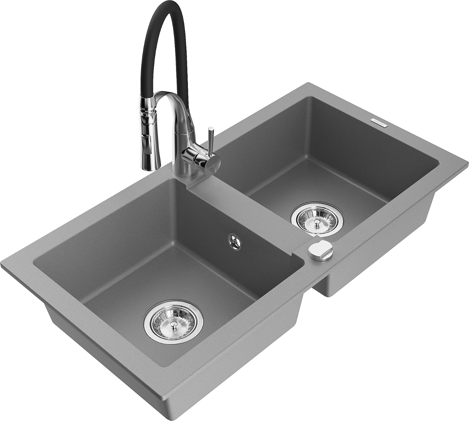 Mexen Mario Granitspüle 2-Kammer mit Küchenarmatur Aster, grau - 6504-71-73450-07