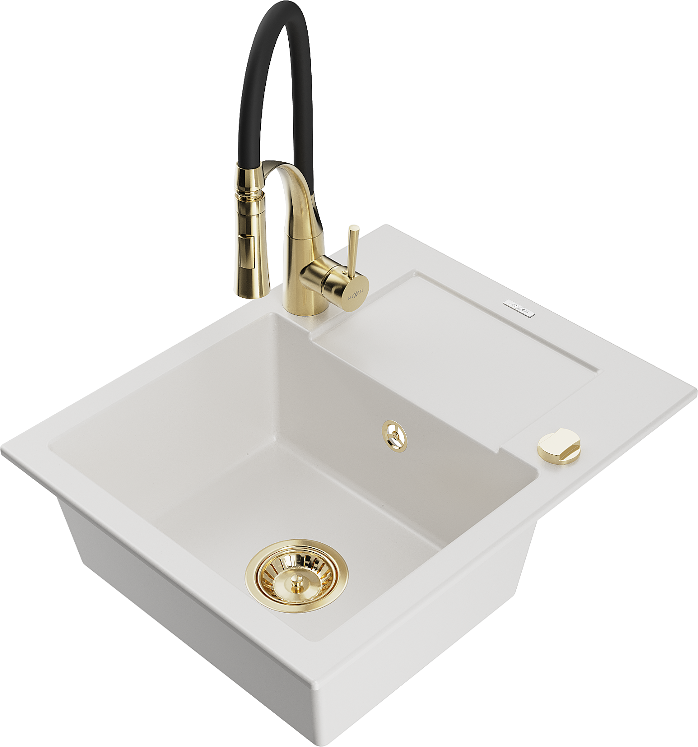Mexen Enzo granitspüle 1-becken mit abtropffläche und küchenarmatur Aster, weiß - 6506-20-73450-57-G