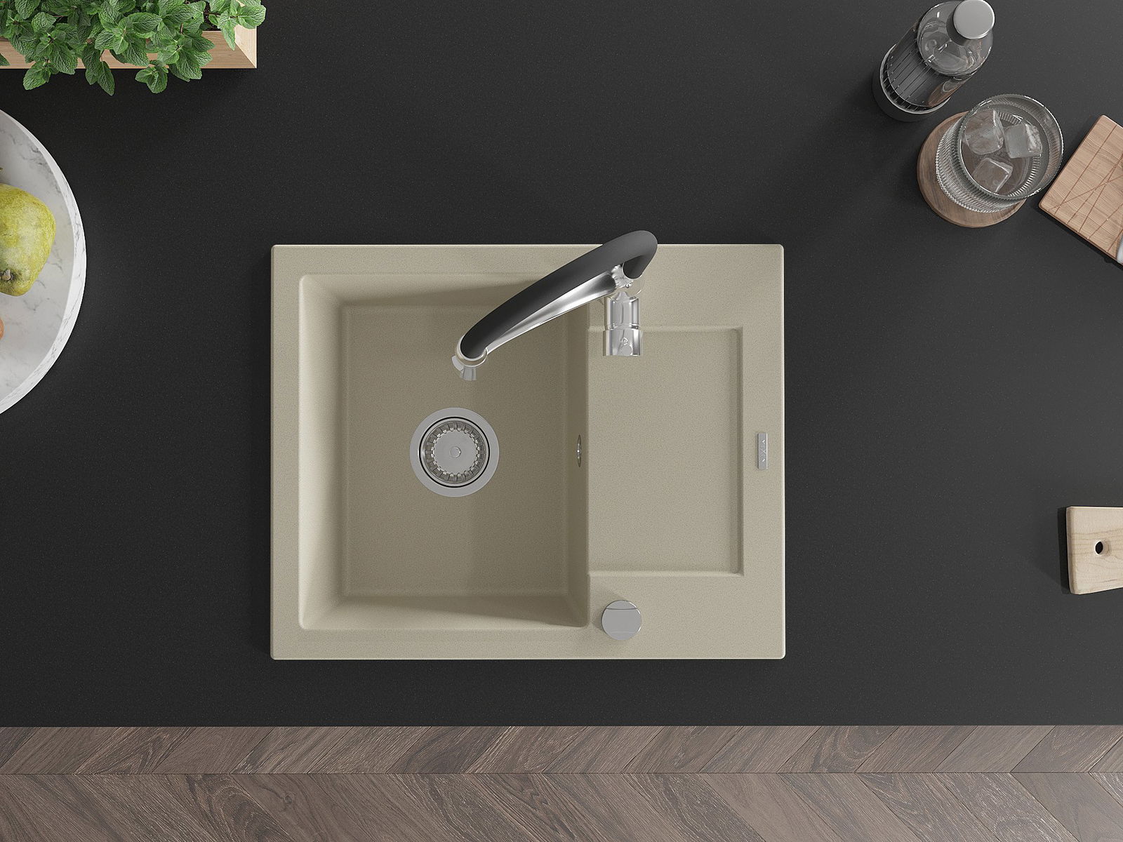 Die Spüle besteht aus hochwertigem Granit. Es ist eine elegante und vor allem praktische Ergänzung zu jeder Küche, unabhängig von ihrem Stil. Hohe Qualität und Granitdauer sorgen für eine langjährige Nutzung.