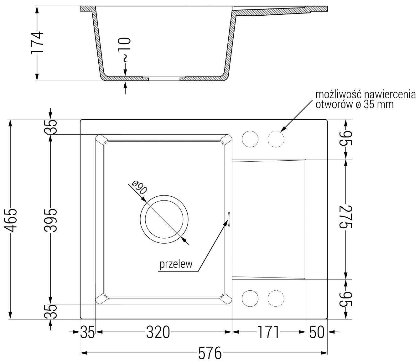 Die Spüle verfügt über 2 verknüpfte Löcher mit einem Durchmesser von 35 mm für sich selbst. Sie können unter anderem verwendet werden Für die Montage eines flüssigen Spenders, der das Vorhandensein von Plastikflaschen in der Küche beseitigt und ihm ein elegantes Finish verleiht.